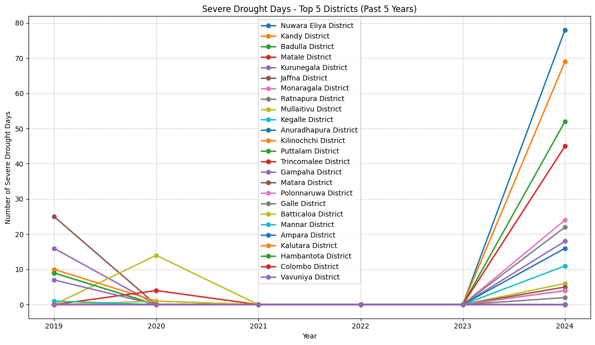 plt.title('Severe Drought Days - Top 5 Districts (Past 5 Years)')