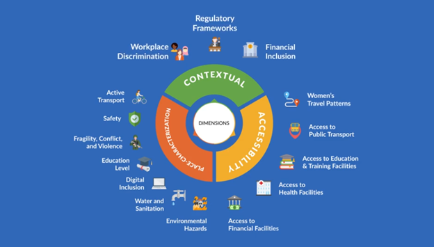 The factors in the Accessibility Dimension were assessed using service areas through network analyses around key facilities, which defined varying levels of access. As anticipated, the highest levels of access to each factor are concentrated in urban centers. Women's Travel Patterns, which relate to essential services needed by women to fulfill their caregiving and household responsibilities, is the factor in this dimension with the fewest highly enabling areas. The latter underscores the need for environments that are better planned with the unique needs and responsibilities of women in mind. This includes ensuring that essential services, such as childcare, pharmacies, and grocery stores, are easily accessible to support women in their roles as caregivers and members of the workforce.