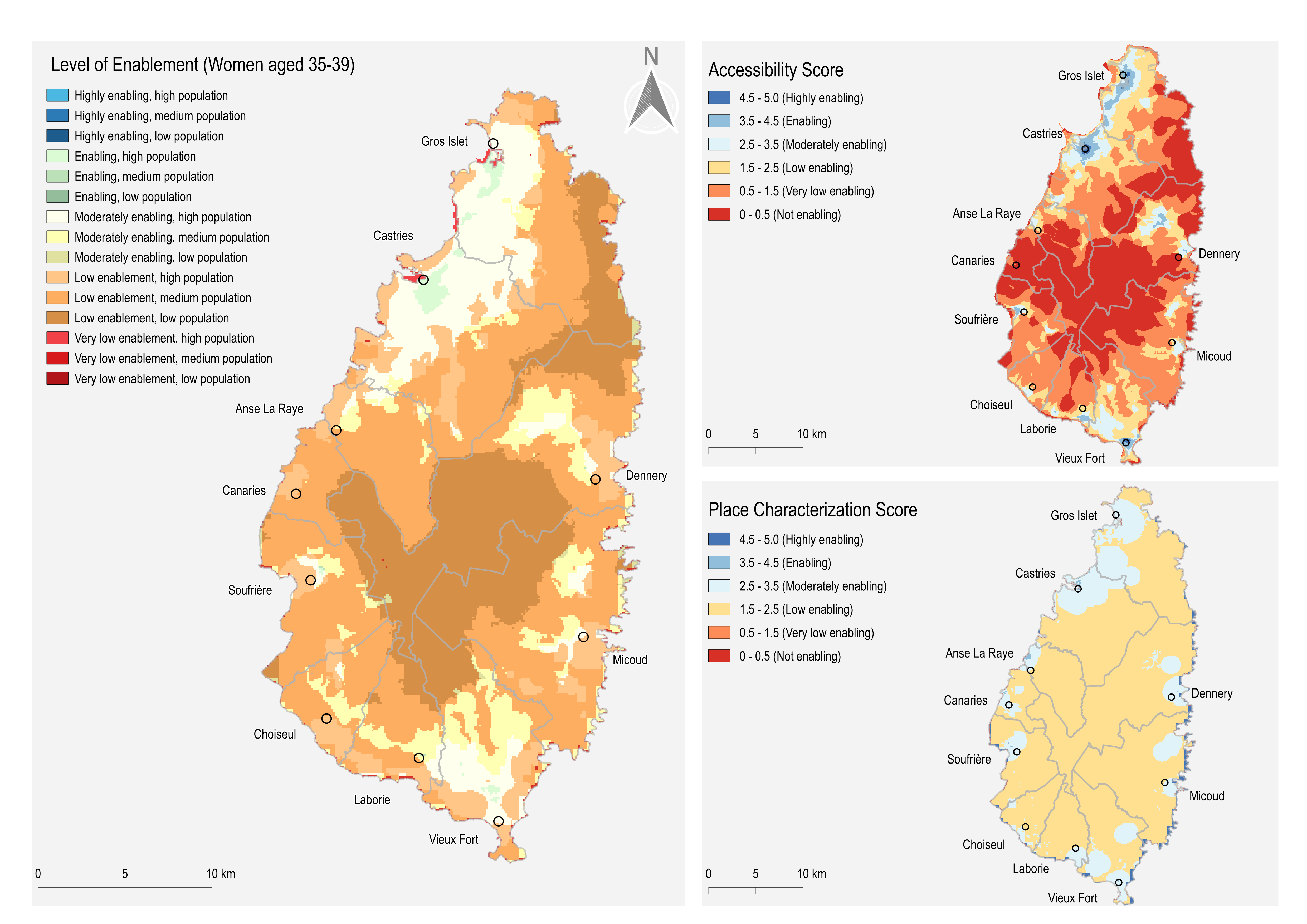 When the enablement scores are combined with data on the distribution of women of working age, specifically those aged 35 to 39, across low, medium, and high population densities, it was observed that the most enabling areas on the island corresponded with regions of high female population. However, a few areas with very high population density were identified as having significantly low enablement scores. For example, the area surrounding the solar plant in Vieux Fort is characterized by a high female population density but is classified as only moderately enabling.
