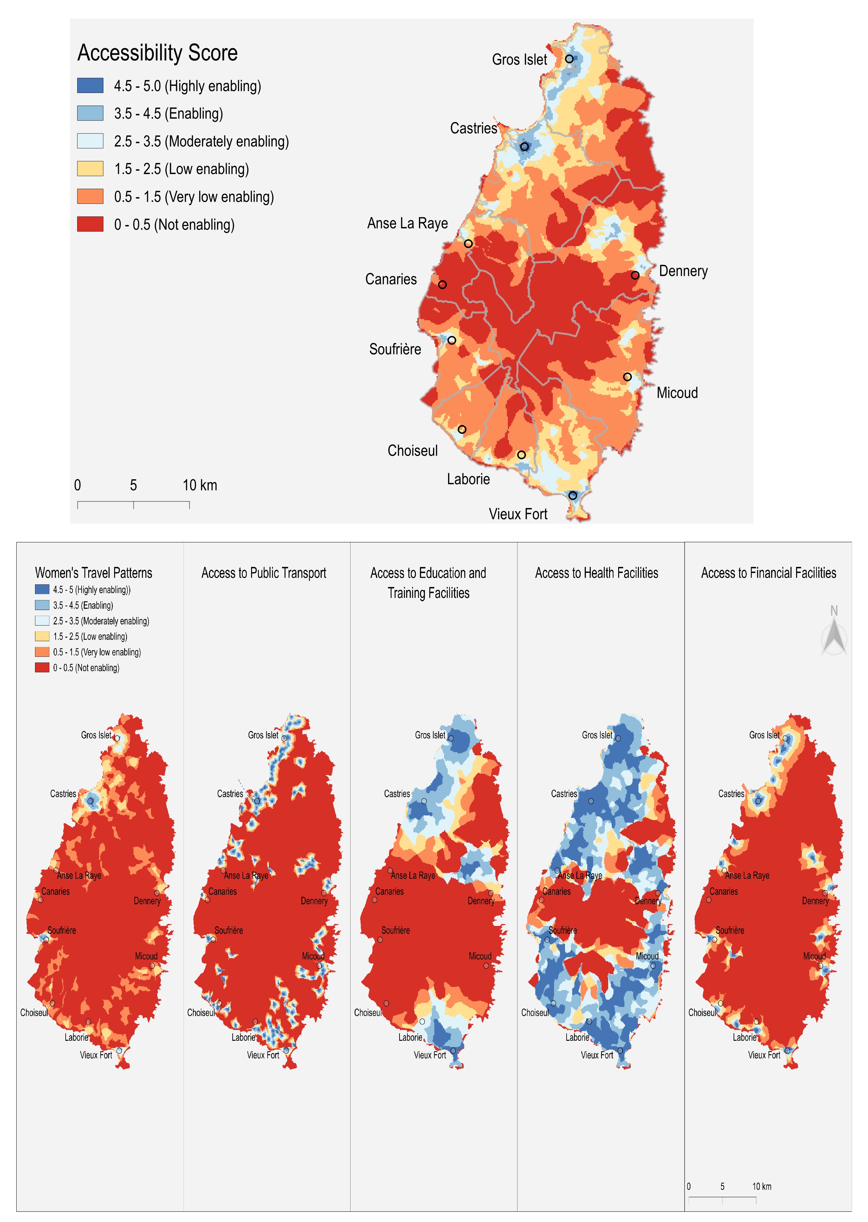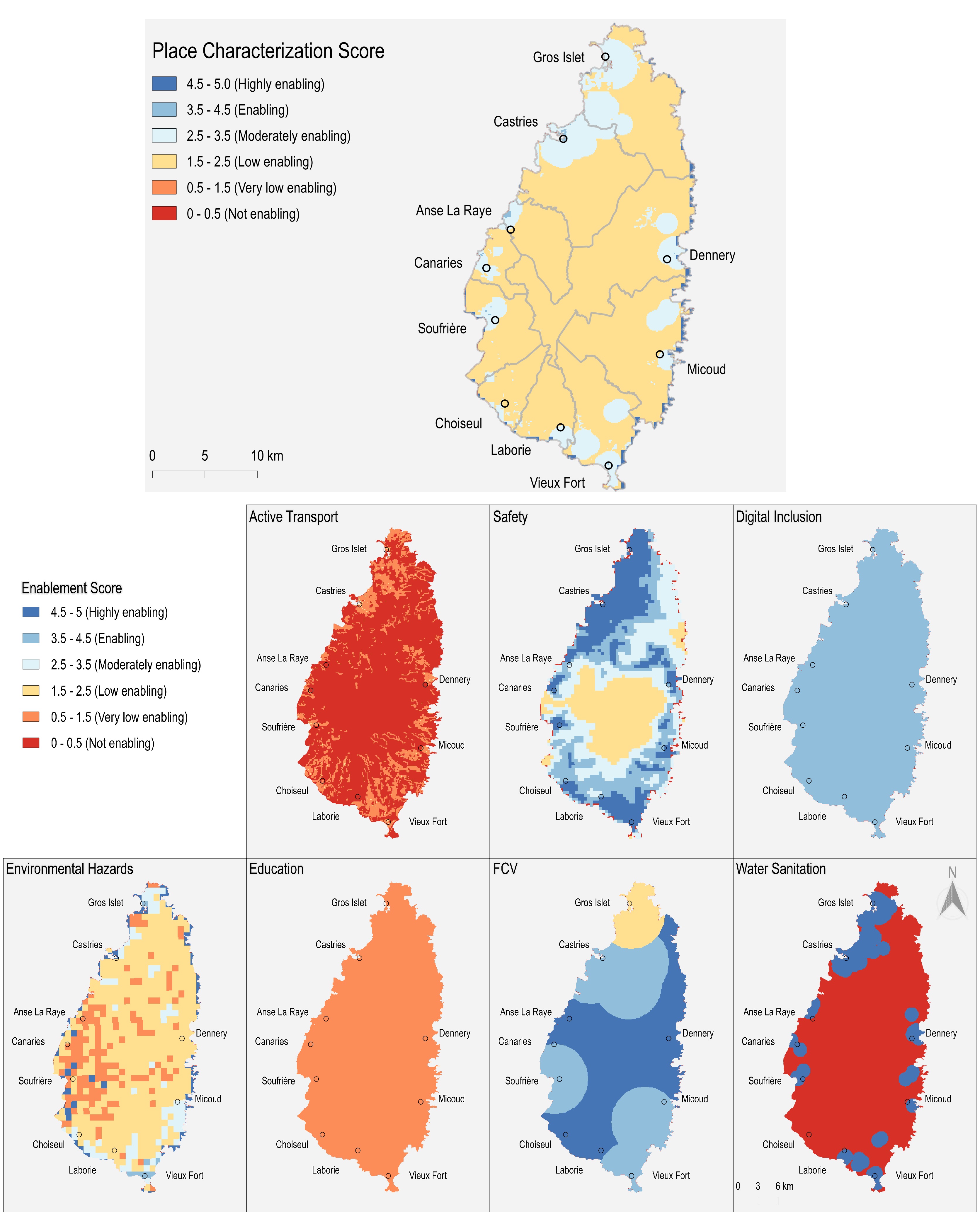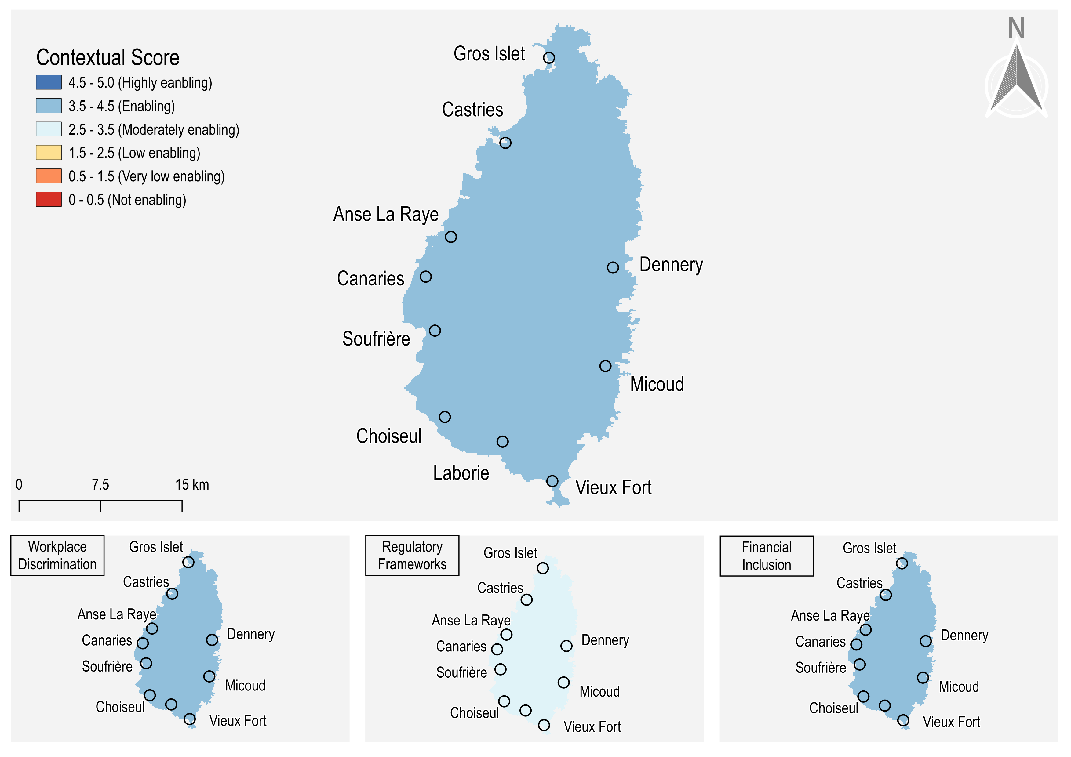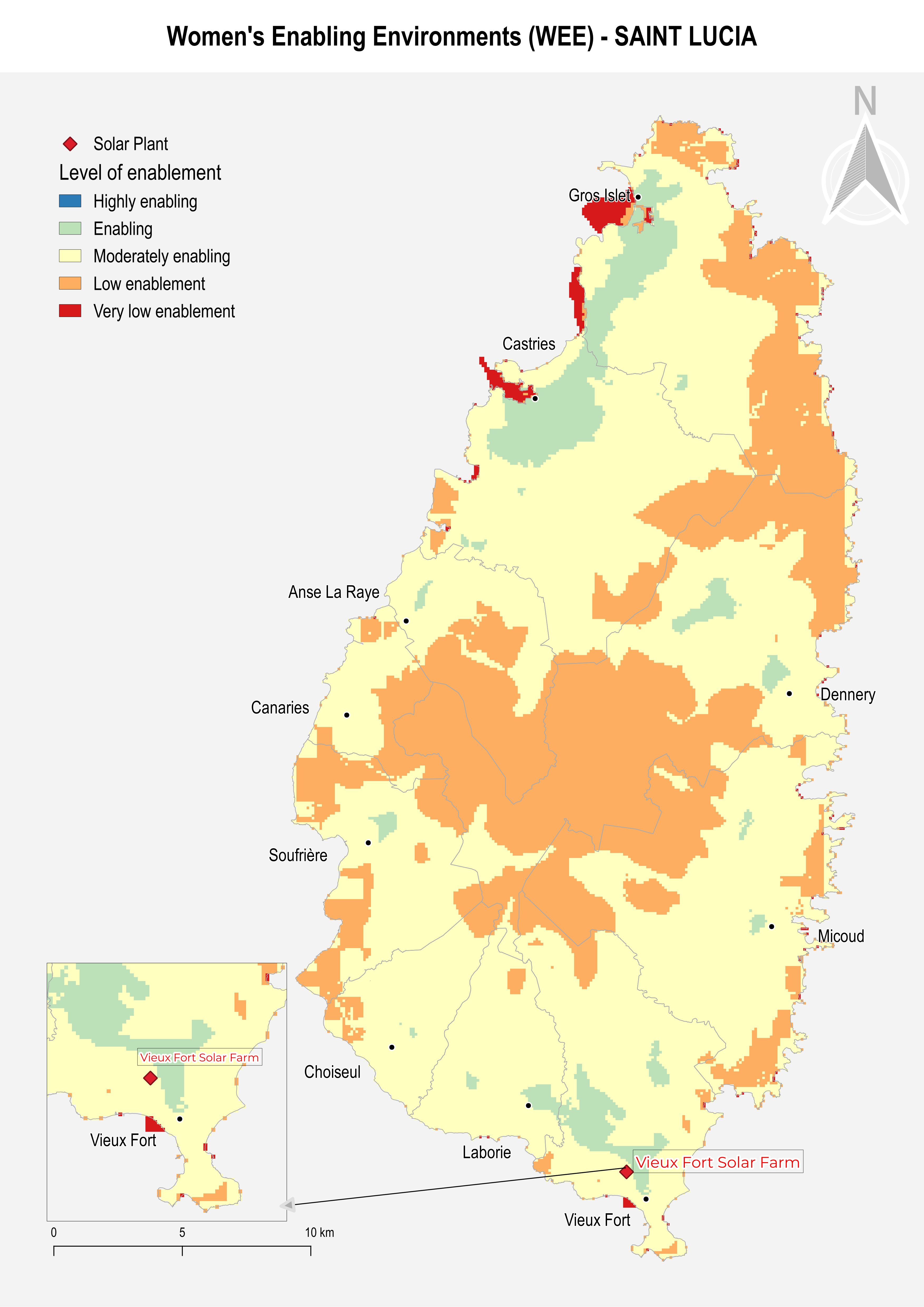 The overall enablement scores for Saint Lucia reveal that, although some areas in the northwest and south exhibit a somewhat supportive environment, the country largely lacks regions that are highly conducive to facilitating women’s access to employment opportunities. Notably, the area around the solar plant in Vieux Fort provides a moderately enabling environment for women's job access, but it still falls short of achieving the highest level of enablement.