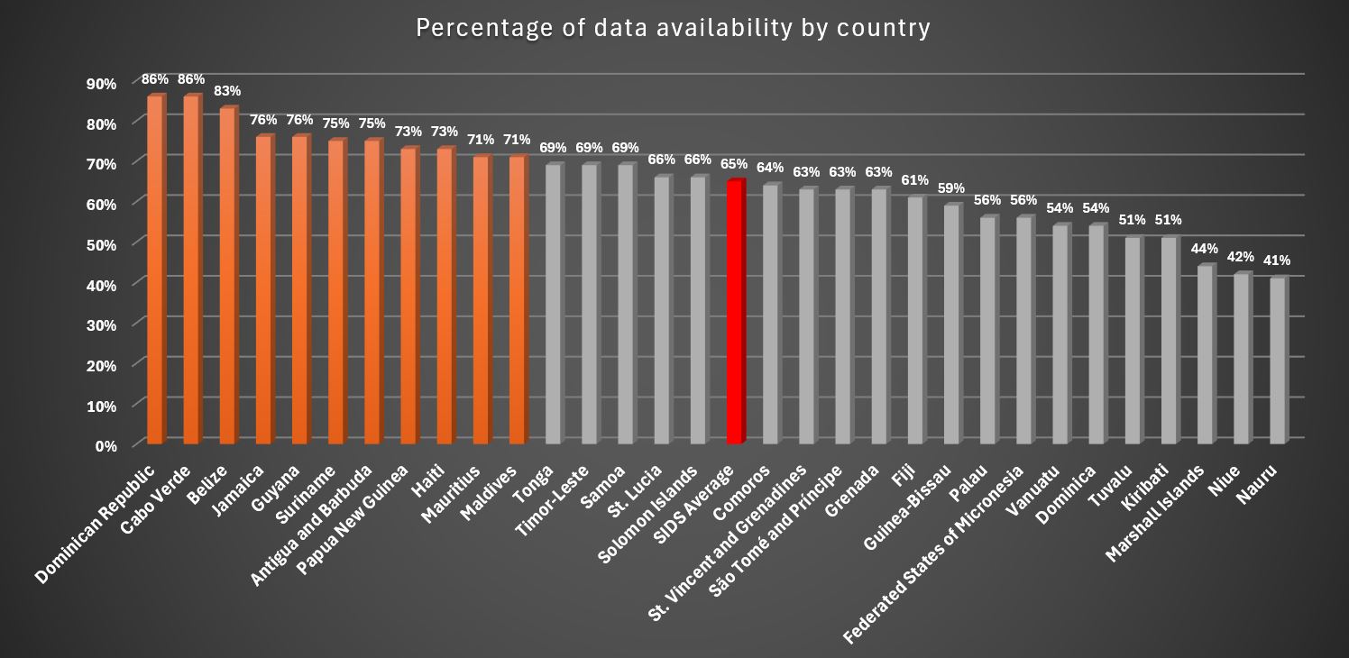 This effort resulted in a Data Gap Analysis Report for each of the 31 SIDS included in the project. The report for each country provides a comprehensive overview of the findings derived from an extensive data gap analysis, specifically centered on women in SIDS and their access (or lack thereof) to employment opportunities within the RE sector. This endeavor entailed thorough desk-based research, necessitating a detailed exploration of both spatial and non-spatial data sources that are publicly available. The focus was on identifying critical open sources, evaluating the resolution and quality of the data, and specifying any pertinent gaps or missing information in each country. The reports are available here: Data Catalog. The following figure summarizes the data availability concerning the datasets examined for each country: