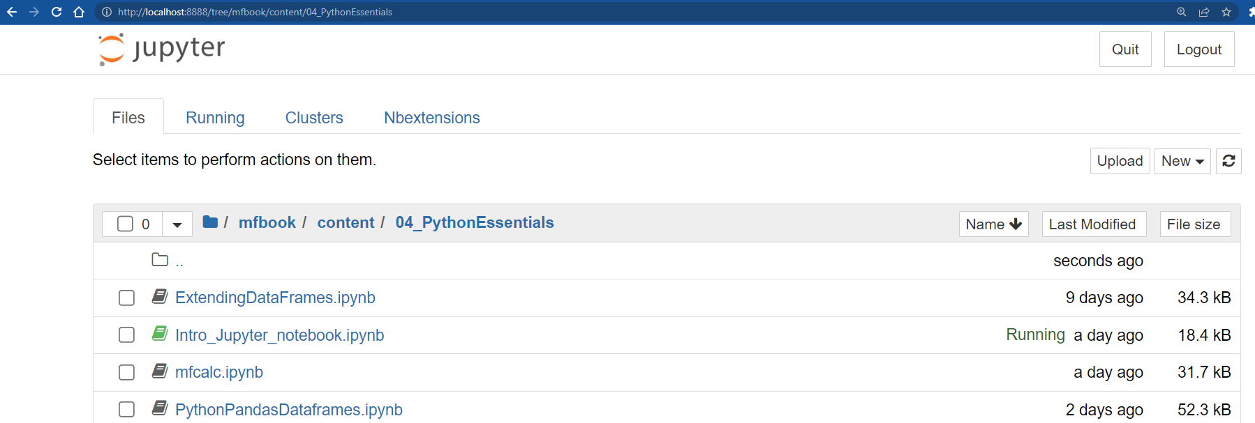 This will launch the Jupyter environment in your default web browser, which should look something like the image below, where the directory structure presented is that of the directory from which the jupyter notebook command was executed (e.g. c:\users\MyUserName\MyJupyterNotebookDirectory).