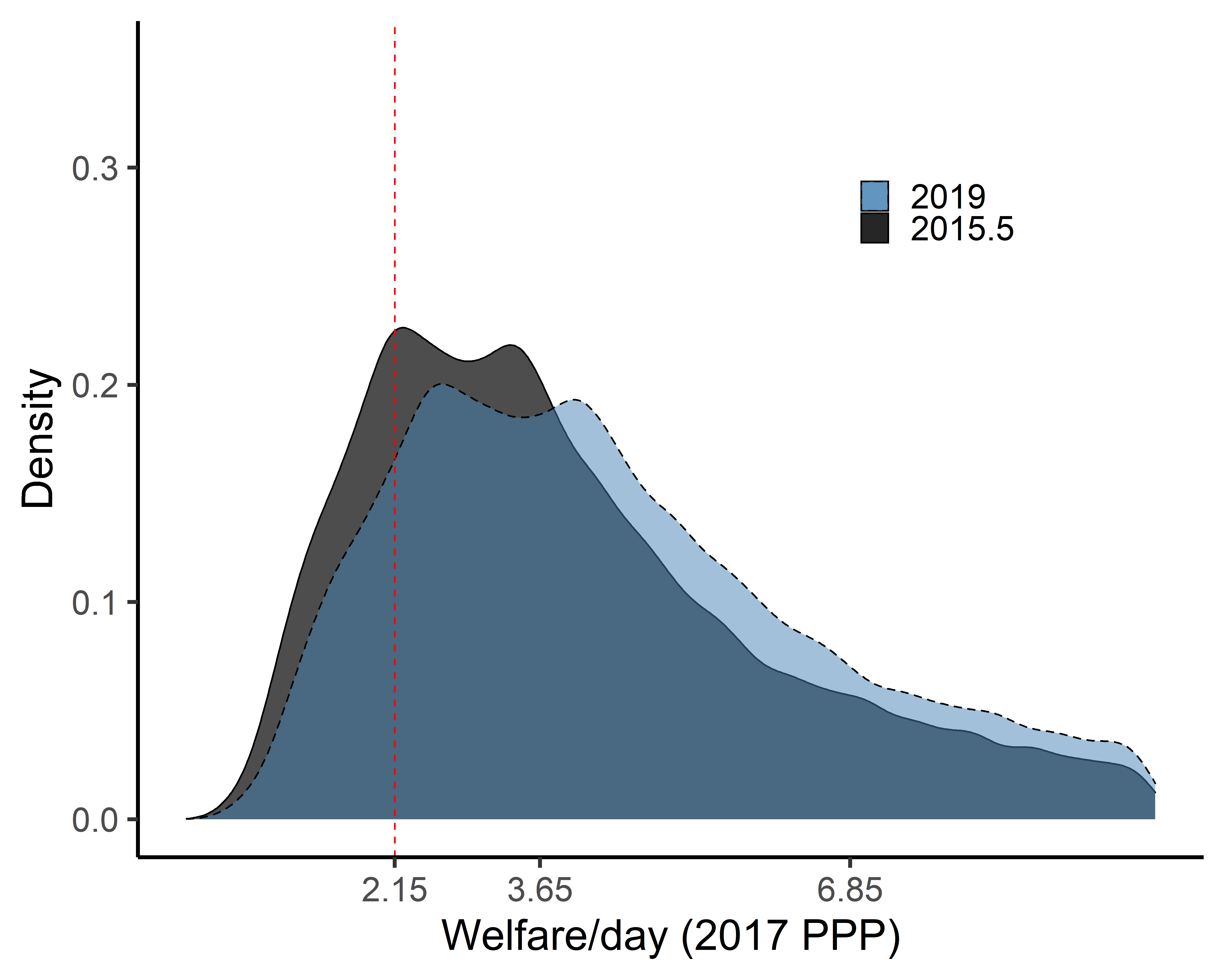 The below example charts the consumption aggregate from the 2015.5 Ethiopian survey expressed in 2017 PPP-adjusted dollars, and the 2018 Ethiopian distribution one would get from extrapolating this welfare vector to 2018 using the method described above. The 2015.5 daily consumption mean is 3.12 and the growth rate in national accounts between 2015.5 and 2018 is 14.5%. Note that the positive growth pushes the distribution to the right. This changes the share of extreme poor – those living below the $2.15 poverty line – from 30.8% in 2015.5 to 22.3% in 2018.