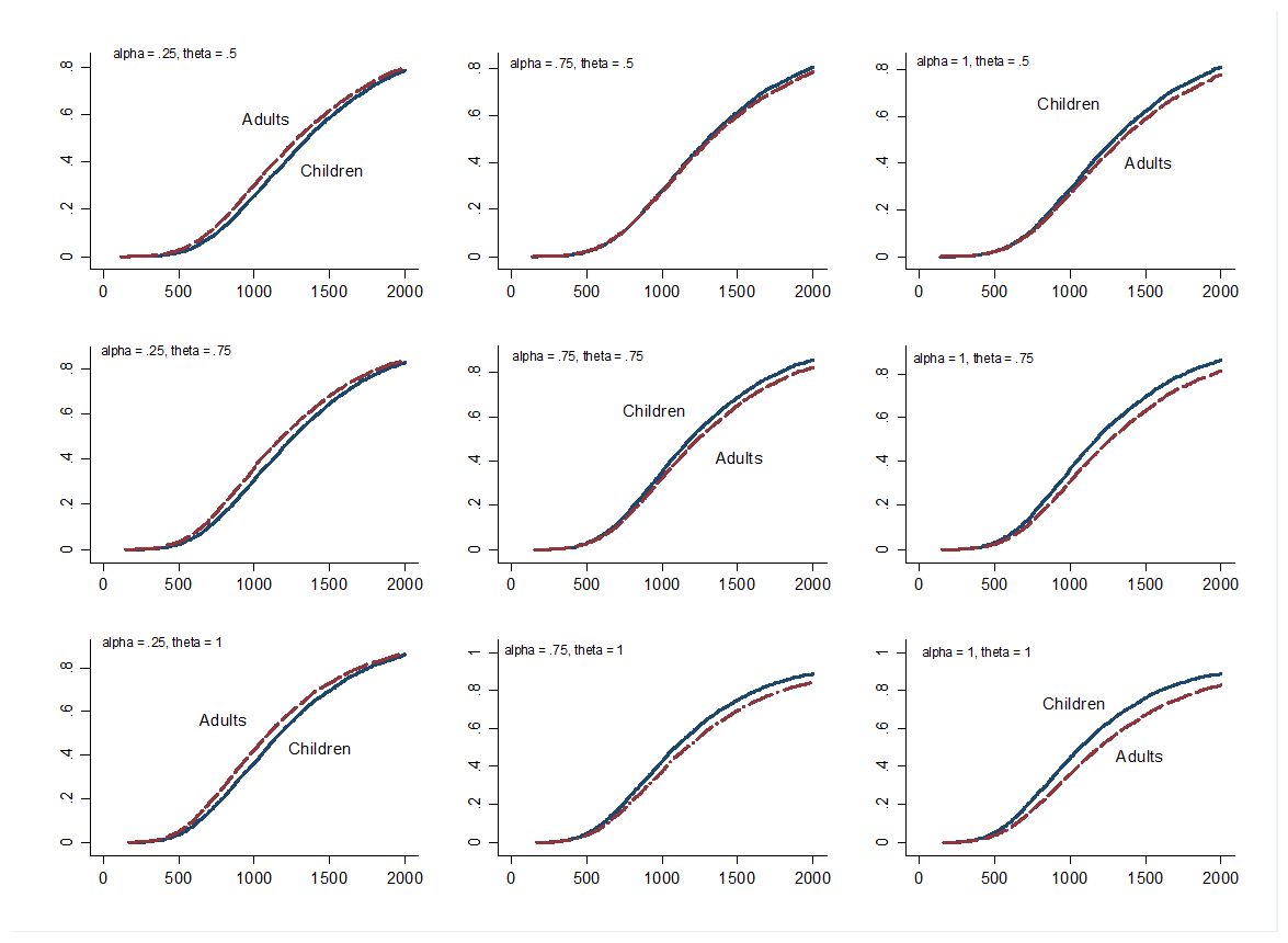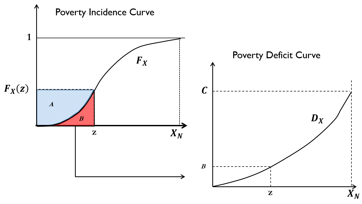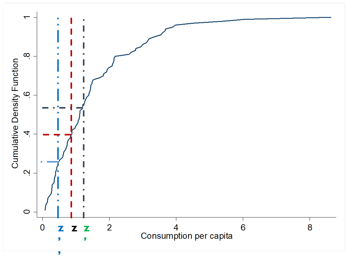 class: center, middle, inverse, title-slide # Sensitivity analysis of poverty ### R.Andres Castaneda (based on the slides of many others that teach this class before me) ### The World Bank ### 2019-07-16 --- # Why checking for robustness? - What do you think are the main reasons why poverty may not be robust? -- 1. Arbitrariness of the choice of Poverty Index 2. Arbitrariness of the choice of Poverty Line 3. Equivalence of scale used 4. Sampling error -- - What else? --- # Elasticity of FGT poverty measure with respect to per capita consumption `$$\eta = \frac{\Delta\%FGT_\alpha(x,z)}{\Delta\%PCE}$$` -- - Shift the distribution without changing its relative shape - Poverty line remains constant - What would happen if there is a concentration of marginal poor around the poverty line? -- - .red[What are the main reasons why the consumption aggreagte may change?] --- ## Graphical representation of change in PCE <img src="./img/pce_shift.png" width="1500" style="display: block; margin: auto auto auto 0;" /> --- ## The same is true if we change the poverty lines - Each component of the absolute poverty line (i.e. CBN) is a function of several variables that affects results - Food component - “Reference” Group could lead to different poverty lines even using the same method; - Nutritional requirement - Average or median of the “reference” population not only for quantities but also for prices - Nonfood component - How do we define the interval (“close”) to the poverty line? - Lower poverty line & upper poverty line --- ## Graphical representation of change in poverty lines <img src="./img/pl_shift.png" width="1500" style="display: block; margin: auto auto auto 0;" /> --- # Poverty Dominance Analysis - Dominance analysis is a comparison of multiple distributions. - It allows us to compare results for all poverty lines when comparing across time/subpopulations - Three relevant poverty curves: - Poverty incidence curves - Poverty deficit curves - Poverty severity curves --- ## Poverty incidence curves <img src="./img/pov_inc_curve.png" width="1629" style="display: block; margin: auto auto auto 0;" /> ??? The height is the headcount ratio when the poverty line is set at a particular level of the welfare aggregate (i.e. income or consumption). In other words, it is the CDF --- layout: true ## 1. First Order Dominance --- - If the poverty incidence curve for distribution A is above that for B for all poverty lines (up to `\(z_{max}\)`)... -- - ... there is more poverty in A than in B for all poverty measures and all poverty lines (up to `\(z_{max}\)`) --- ### Graphically it looks like this <img src="./img/fst_ord_dom.png" width="1500" style="display: block; margin: auto auto auto 0;" /> --- ### but, - What if the poverty incidence curves intersect? -- <img src="./img/not_fst_ord_dom.png" width="1500" style="display: block; margin: auto auto auto 0;" /> --- ### but, - What if the poverty incidence curves intersect? - Ambiguous poverty ranking - What could you do? - Restrict range of poverty lines - Restrict class of poverty measures --- ### Poverty Deficit curves - Area under poverty incidence curve - The height is proportional to the poverty gap measure, the larger the height the larger the poverty gap measure for a given poverty line or level of welfare aggregate - Each point gives average poverty gap = poverty gap index times the poverty line `\(z\)` --- ### Graphically, it look like this <img src="./img/pov_deficit_curve.png" width="1828" style="display: block; margin: auto;" /> layout: false --- layout: true ## 2. Second Order Dominance --- - If the poverty deficit curve for distribution A is above that for B for all poverty lines (up to `\(z_{max}\)`)... - ...there is more poverty in A than in B for all poverty measures which are strictly decreasing and weakly---convex in welfare aggregate (i.e. consumption or income) of the poor such as the Poverty Gap and Severity but not Headcount Ratio --- <img src="./img/def_curve1.png" width="70%" style="display: block; margin: auto;" /> --- ### But, - What if the poverty deficit curves intersect? -- <img src="./img/def_curve2.png" width="70%" style="display: block; margin: auto;" /> --- ### But, - What if the poverty deficit curves intersect? - Ambiguous poverty ranking -- - What could you do? - Restrict range of poverty lines - Restrict class of poverty measures -- - .blue[... And so on and so forth with poverty severity] --- layout: false # Poverty dominance analysis - Recommendations - First Order: construct the poverty incidence curves up to highest admissible poverty line for each - distribution - Do not cross `\(\rightarrow\)` Unambiguous comparison (2nd and 3rd Order holds too) - Do cross `\(\rightarrow\)` perform Second Order Dominance test - Second Order: build poverty deficit curves and restrict range of proper measures - Do not cross `\(\rightarrow\)` Unambiguous comparison for higher order poverty indexes - Do cross `\(\rightarrow\)` perform Third Order Dominance Test - Third Order: create poverty severity curves - Do not cross `\(\rightarrow\)` Unambiguous comparison - Do cross `\(\rightarrow\)` nothing left to do --- layout: true # Equivalence of Scales --- - Two options for the arbitrary approack - OECD - Modified scale `$$AE_{OECD} = 1 + 0.5 \times (N_A - 1) + 0.3 \times N_C$$` Where, - `\(N_A =\)` Total number of adults - `\(N_C =\)` Totol number of children - LSMS (National Research Council '95) `$$AE_{LSMS} = (N_A - \alpha N_C)^\theta$$` Where, - `\(\alpha =\)` Adult equivalent `\(\in (0,1)\)` - `\(\theta =\)` Economies of scale `\(\in (0,1)\)` --- ## To check the sensitivity of the paremeters - Select a "pivot" household which is unaffected by changes in parameters - It could be any _household composition_ that would be chosen as modal type: `\((N_{A0};N_{A0})\)` - Ex: Two adults and two children `$$x^* = \frac{x} {(N_A + \alpha N_C)^\theta} \frac{(N_{A0} + \alpha N_{C0})^\theta} {(N_{A0} + N_{C0})}$$` - `\(x^*\)` is alway