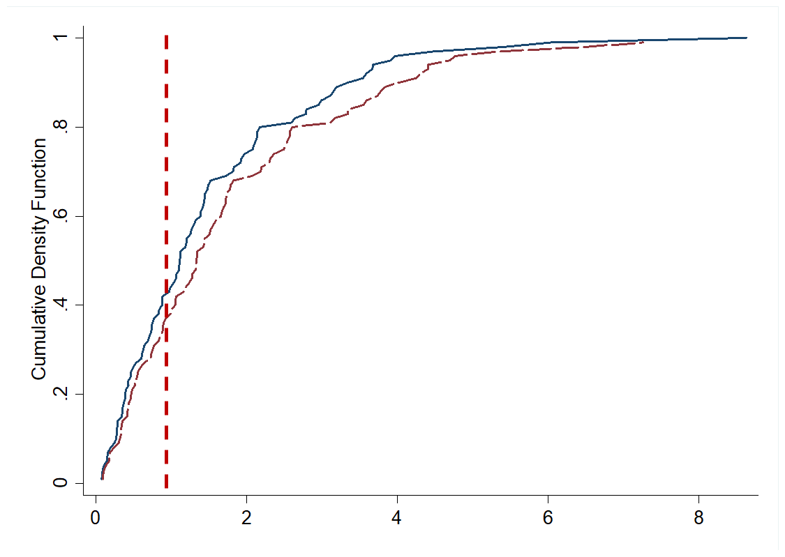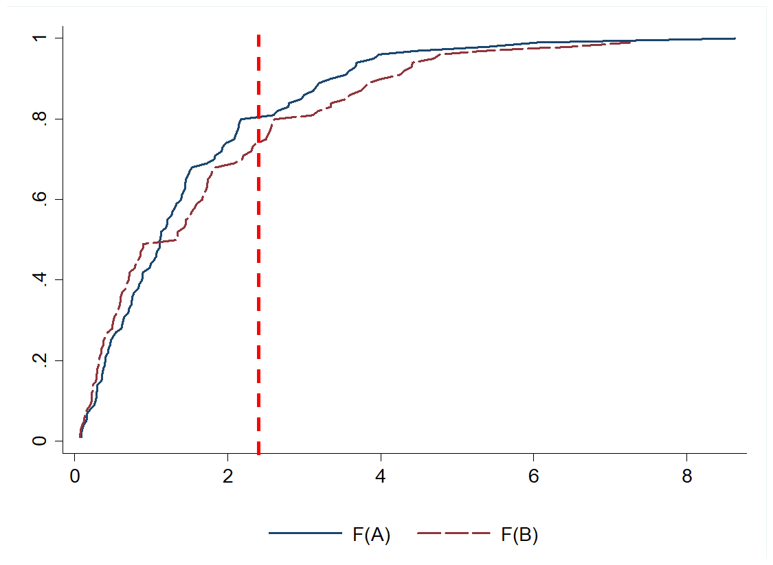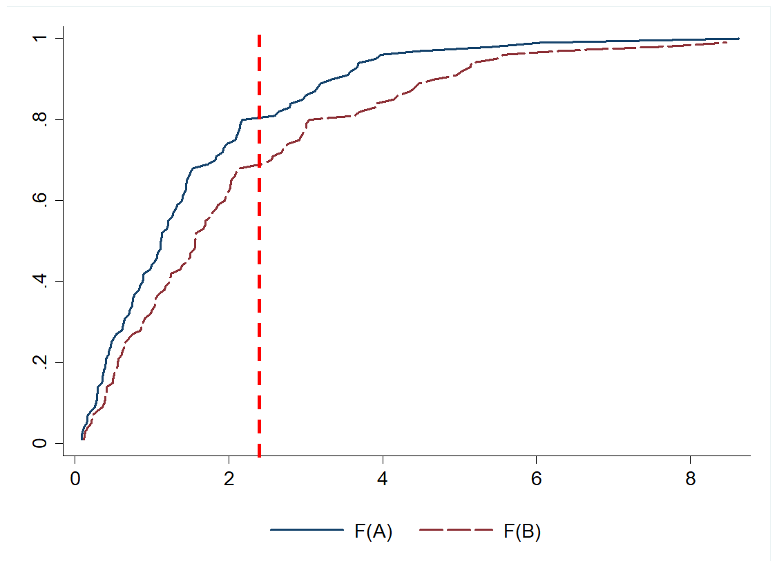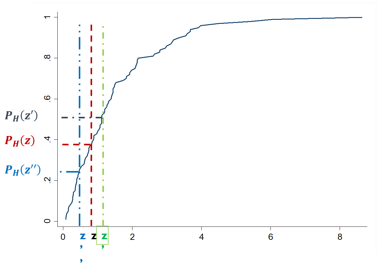 class: center, middle, inverse, title-slide # Sensitivity analysis of poverty ### R.Andres Castaneda (based on the slides of many others that teach this class before me) ### The World Bank ### 2019-07-16 --- # Why checking for robustness? - What do you think are the main reasons why poverty may not be robust? -- 1. Arbitrariness of the choice of Poverty Index 2. Arbitrariness of the choice of Poverty Line 3. Equivalence of scale used 4. Sampling error -- - What else? --- # Elasticity of FGT poverty measure with respect to per capita consumption `$$\eta = \frac{\Delta\%FGT_\alpha(x,z)}{\Delta\%PCE}$$` -- - Shift the distribution without changing its relative shape - Poverty line remains constant - What would happen if there is a concentration of marginal poor around the poverty line? -- - .red[What are the main reasons why the consumption aggreagte may change?] --- ## Graphical representation of change in PCE <img src="./img/pce_shift.png" width="1500" style="display: block; margin: auto auto auto 0;" /> --- ## The same is true if we change the poverty lines - Each component of the absolute poverty line (i.e. CBN) is a function of several variables that affects results - Food component - “Reference” Group could lead to different poverty lines even using the same method; - Nutritional requirement - Average or median of the “reference” population not only for quantities but also for prices - Nonfood component - How do we define the interval (“close”) to the poverty line? - Lower poverty line & upper poverty line --- ## Graphical representation of change in poverty lines <img src="./img/pl_shift.png" width="1500" style="display: block; margin: auto auto auto 0;" /> --- # Poverty Dominance Analysis - Dominance analysis is a comparison of multiple distributions. - It allows us to compare results for all poverty lines when comparing across time/subpopulations - Three relevant poverty curves: - Poverty incidence curves - Poverty deficit curves - Poverty severity curves --- ## Poverty incidence curves <img src="./img/pov_inc_curve.png" width="1629" style="display: block; margin: auto auto auto 0;" /> ??? The height is the headcount ratio when the poverty line is set at a particular level of the welfare aggregate (i.e. income or consumption). In other words, it is the CDF --- layout: true ## 1. First Order Dominance --- - If the poverty incidence curve for distribution A is above that for B for all poverty lines (up to `\(z_{max}\)`)... -- - ... there is more poverty in A than in B for all poverty measures and all poverty lines (up to `\(z_{max}\)`) --- ### Graphically it looks like this <img src="./img/fst_ord_dom.png" width="1500" style="display: block; margin: auto auto auto 0;" /> --- ### but, - What if the poverty incidence curves intersect? -- <img src="./img/not_fst_ord_dom.png" width="1500" style="display: block; margin: auto auto auto 0;" /> --- ### but, - What if the poverty incidence curves intersect? - Ambiguous poverty ranking - What could you do? - Restrict range of poverty lines - Restrict class of poverty measures --- ### Poverty Deficit curves - Area under poverty incidence curve - The height is proportional to the poverty gap measure, the larger the height the larger the poverty gap measure for a given poverty line or level of welfare aggregate - Each point gives average poverty gap = poverty gap index times the poverty line `\(z\)` --- ### Graphically, it look like this <img src="./img/pov_deficit_curve.png" width="1828" style="display: block; margin: auto;" /> layout: false --- layout: true ## 2. Second Order Dominance --- - If the poverty deficit curve for distribution A is above that for B for all poverty lines (up to `\(z_{max}\)`)... - ...there is more poverty in A than in B for all poverty measures which are strictly decreasing and weakly---convex in welfare aggregate (i.e. consumption or income) of the poor such as the Poverty Gap and Severity but not Headcount Ratio --- <img src="./img/def_curve1.png" width="70%" style="display: block; margin: auto;" /> --- ### But, - What if the poverty deficit curves intersect? -- <img src="./img/def_curve2.png" width="70%" style="display: block; margin: auto;" /> --- ### But, - What if the poverty deficit curves intersect? - Ambiguous poverty ranking -- - What could you do? - Restrict range of poverty lines - Restrict class of poverty measures -- - .blue[... And so on and so forth with poverty severity] --- layout: false # Poverty dominance analysis - Recommendations - First Order: construct the poverty incidence curves up to highest admissible poverty line for each - distribution - Do not cross `\(\rightarrow\)` Unambiguous comparison (2nd and 3rd Order holds too) - Do cross `\(\rightarrow\)` perform Second Order Dominance test - Second Order: build poverty deficit curves and restrict range of proper measures - Do not cross `\(\rightarrow\)` Unambiguous comparison for higher order poverty indexes - Do cross `\(\rightarrow\)` perform Third Order Dominance Test - Third Order: create poverty severity curves - Do not cross `\(\rightarrow\)` Unambiguous comparison - Do cross `\(\rightarrow\)` nothing left to do --- layout: true # Equivalence of Scales --- - Two options for the arbitrary approack - OECD - Modified scale `$$AE_{OECD} = 1 + 0.5 \times (N_A - 1) + 0.3 \times N_C$$` Where, - `\(N_A =\)` Total number of adults - `\(N_C =\)` Totol number of children - LSMS (National Research Council '95) `$$AE_{LSMS} = (N_A - \alpha N_C)^\theta$$` Where, - `\(\alpha =\)` Adult equivalent `\(\in (0,1)\)` - `\(\theta =\)` Economies of scale `\(\in (0,1)\)` --- ## To check the sensitivity of the paremeters - Select a "pivot" household which is unaffected by changes in parameters - It could be any _household composition_ that would be chosen as modal type: `\((N_{A0};N_{A0})\)` - Ex: Two adults and two children `$$x^* = \frac{x} {(N_A + \alpha N_C)^\theta} \frac{(N_{A0} + \alpha N_{C0})^\theta} {(N_{A0} + N_{C0})}$$` - `\(x^*\)` is alway