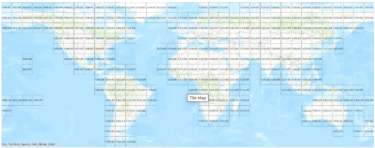 The product is distributed in 10x10° tiles, in a lat/lon (geographic) projection. The tiles are 4800 x 4800 pixels, with pixel size of 0.0020833 degrees (~232 m at the equator). An example product file name for the HDF is MCDWD_L3_NRT.A2021046.h30v12.061.hdf, indicating date in YYYYDOY (YYYY=year; DOY=day-of-year) format, and tile h-v in MODIS linear latitude/longitude grid.