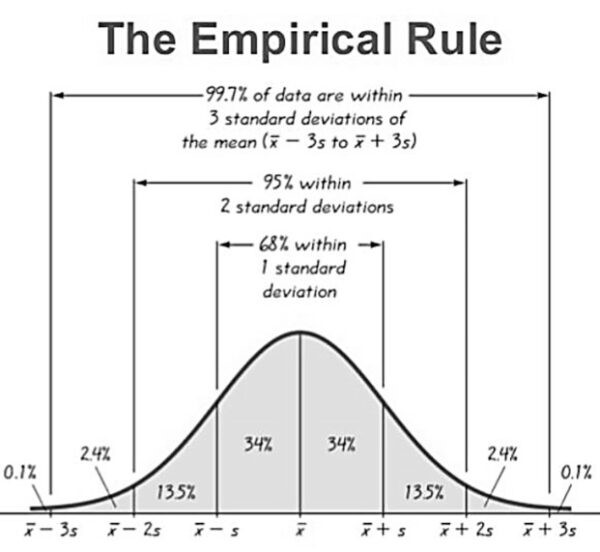 The 3-sigma rule considers as an anomaly those values that are lower than the average minus 3 times the standard deviation. In other words, anomalies are those values that are lower than 99.6% of the values in the pre-war context. Similarly, the 2.5-sigma rules consider anomalies those values that are lower than the average minus 2.5 standard deviations. The 3-sigma rule is more conservative while the 2.5-sigma rule can result in a higher number of false alarms. See example of this empirical rule below.