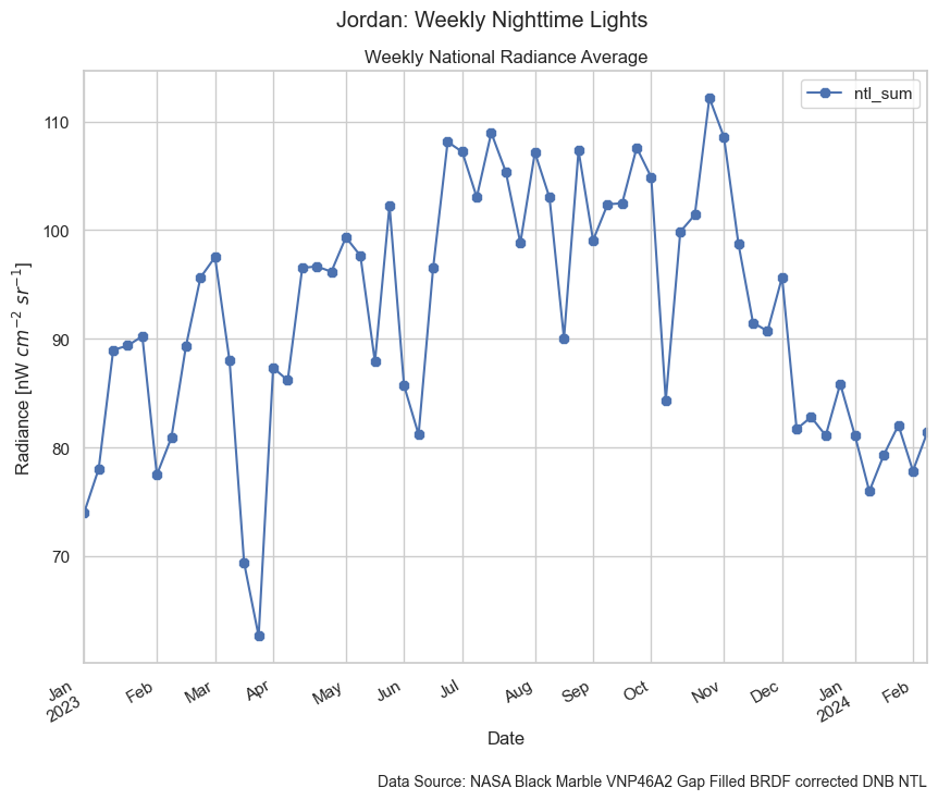 The purpose of this notebook is to conduct an examination of the spatial and temporal distribution of nighttime lights, using NASA Black Marble, nationally and across districts in Jordan.