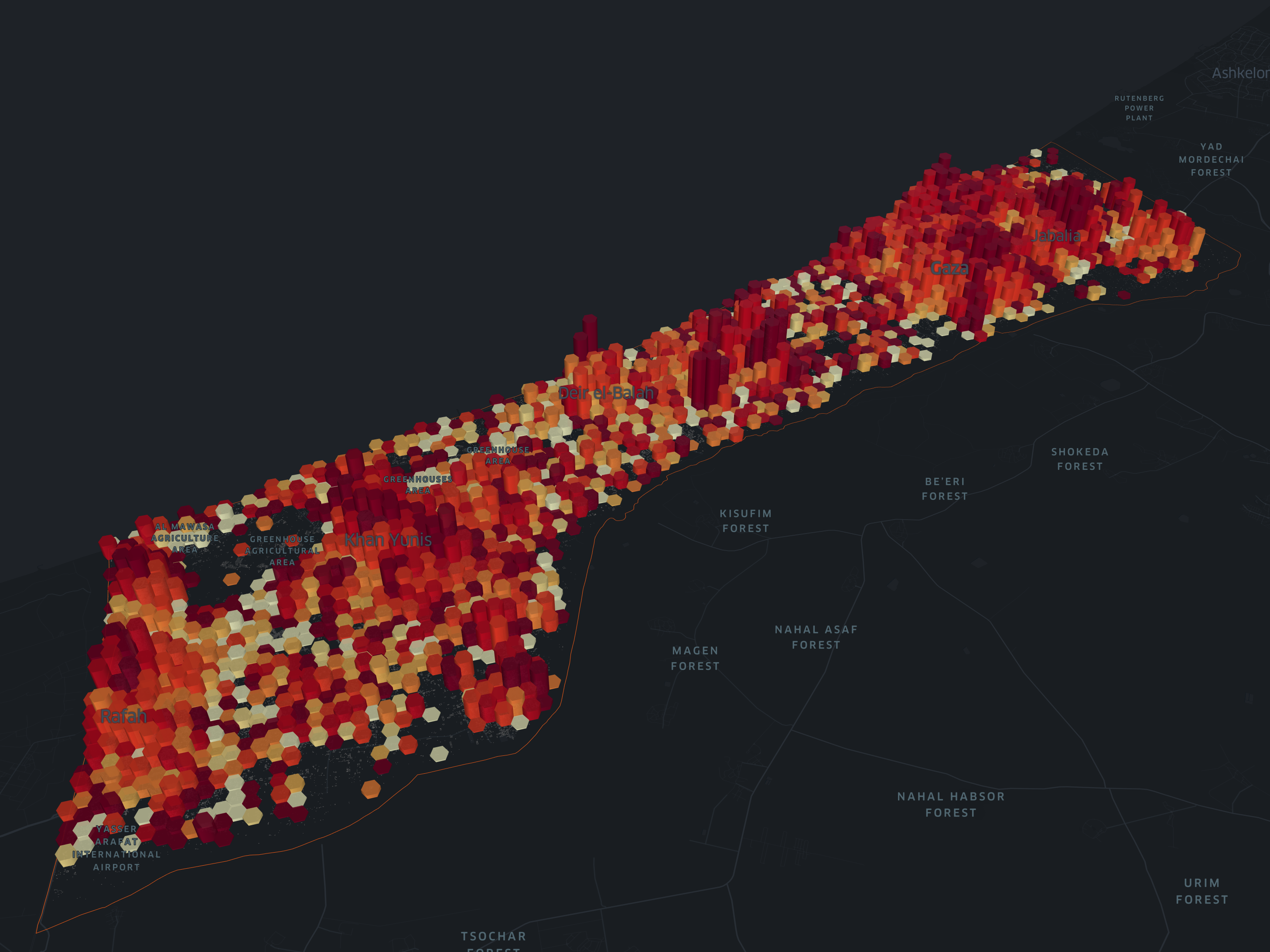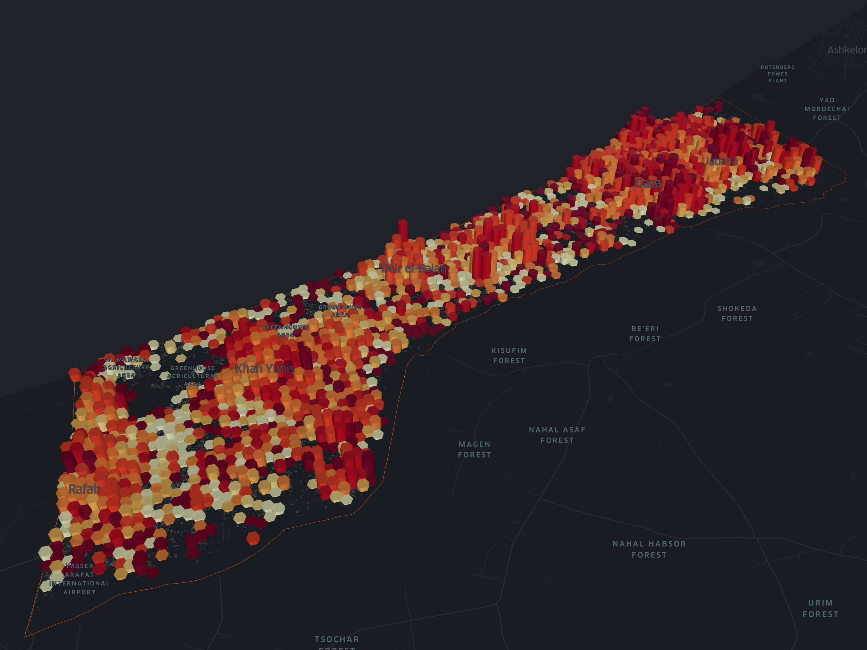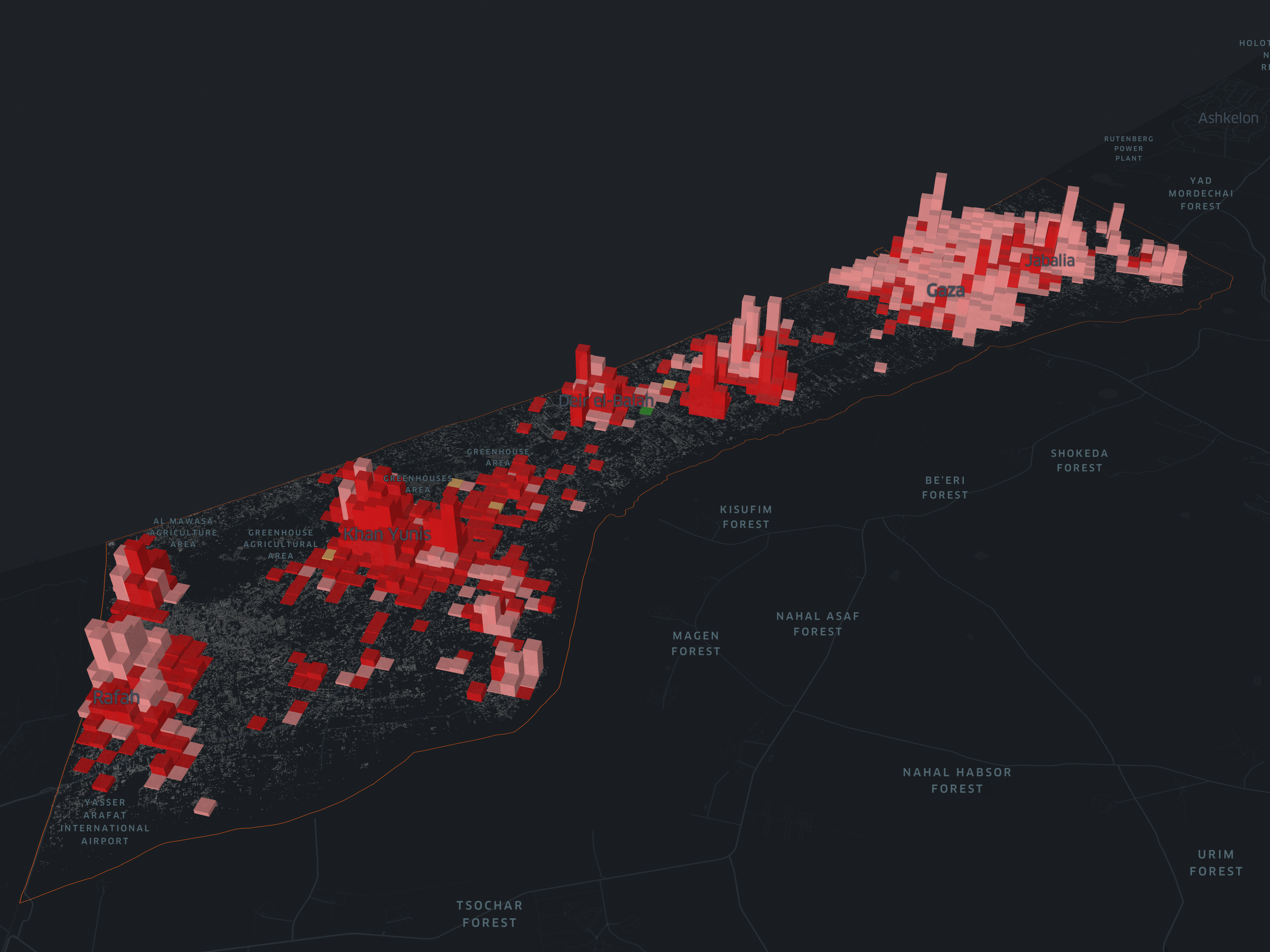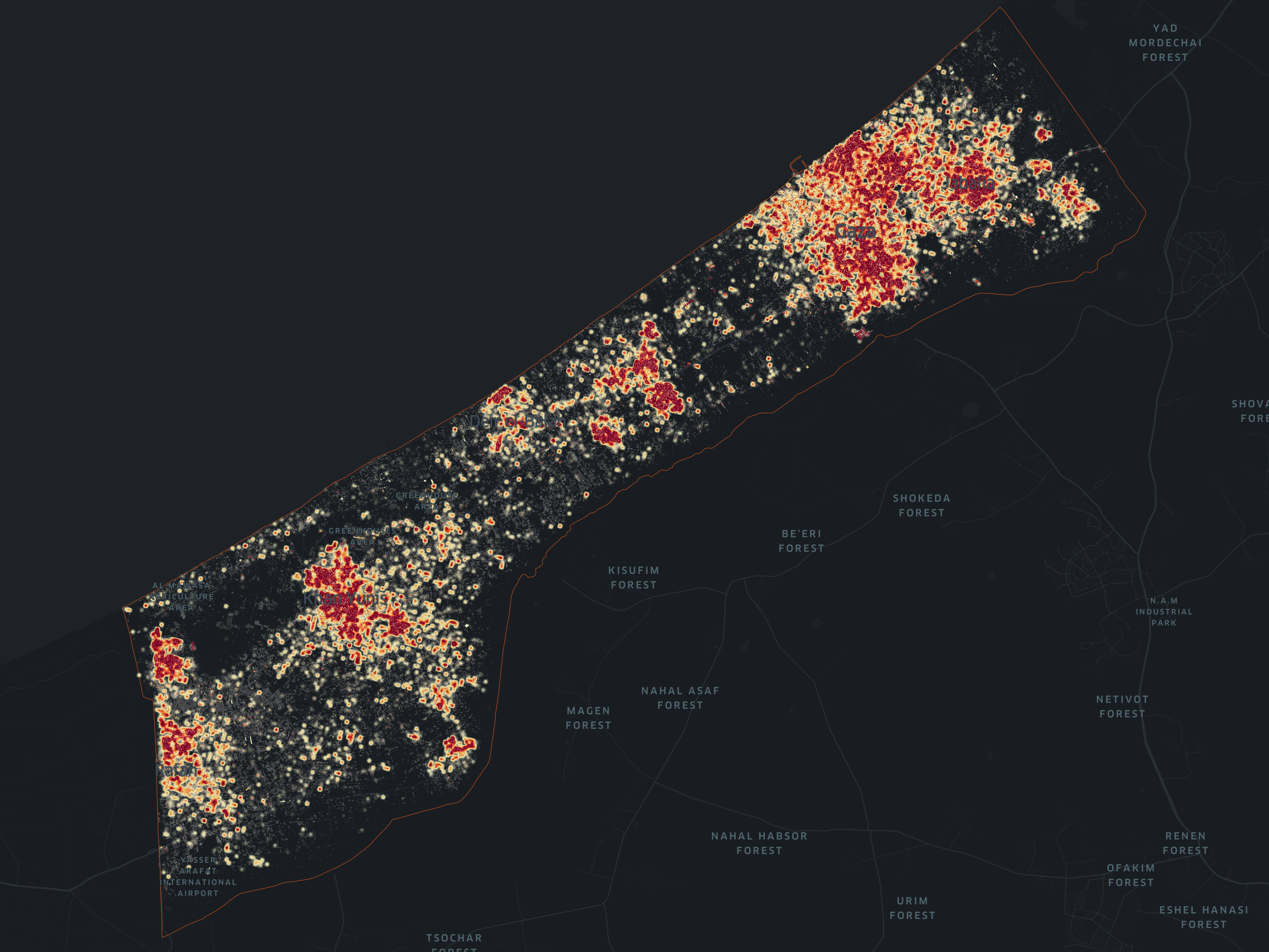 Heatmap depicting estimated damage inflicted to buildings in the Gaza Strip utilizing SAR imagery to evaluate the extent and geographical distribution of estimated destruction. Brighter regions indicate higher levels of damage, denoting the intensity of estimated damage on scale from 0 to 1, from white to red, where 1 signifies total damage.
