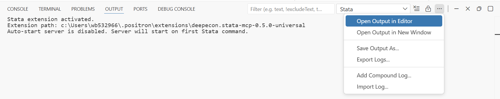 This was a known issue with Stata MCP extension that has been resolved after this GitHub issue. It happened when running code from OneDrive folder because our one drive folder has a space in the name (“OneDrive - WBG”). A workaround is to move the code to a different folder without spaces in the path, for example