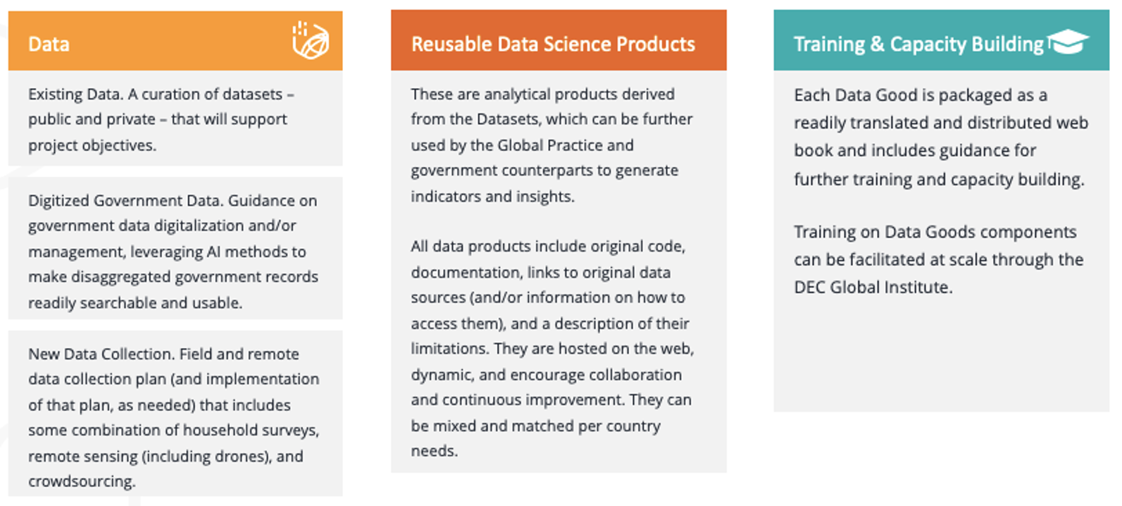 To support acheivement of these objectives and idenitified needs for the GCP, a Data Good can be prepared around three components: