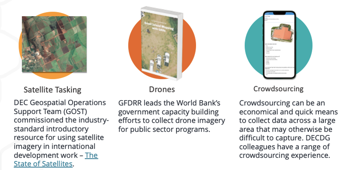 Under Pillar 3: Reducing flood and drought risks through sustainable water resources management, the Resilient Futures progra led by DECDG will support mix-mode household survey systems that will be interoperable with geospatial data sources and derived products to understand the micro-level resilience to and impacts of extreme weather events and that will also provide opportunities for in-situ sensor deployments in sampled communities to obtain highly-localized measurements of climatic events that may otherwise be missed due to the deficiencies in the spatial and temporal resolution of publicly available satellite imagery and derived geospatial data products.