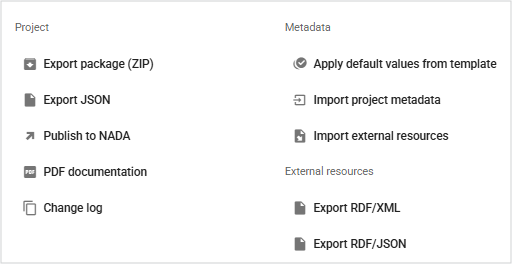 This option allows you to generate a ZIP file containing all metadata and resources related to the project. This package can be shared with others, who can then import it in their own Metadata Editor.