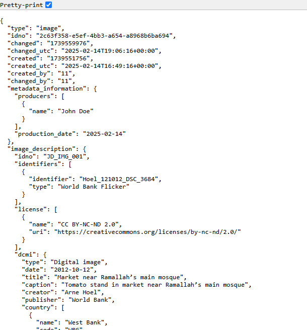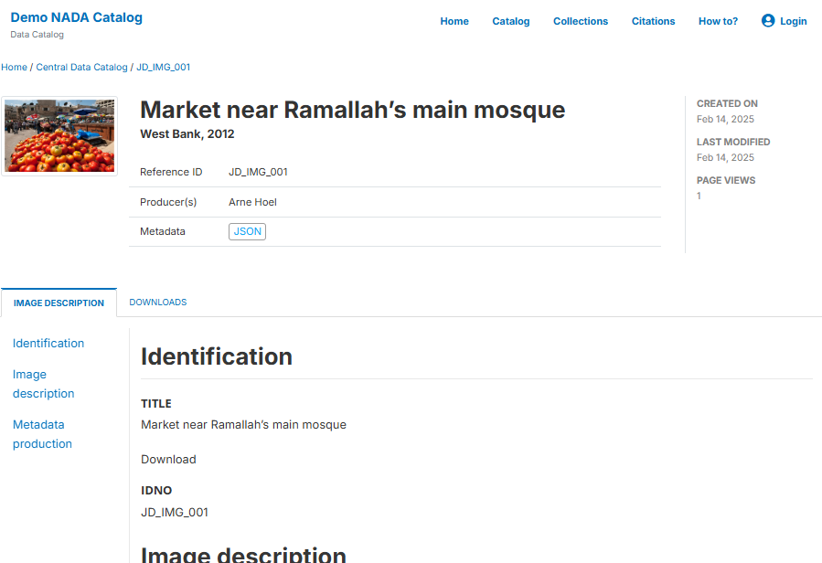 In this example, we will document an image extracted from the World Bank photo collection in Flickr (https://www.flickr.com/photos/worldbank/14131666634/in/album-72157626025379650). This image shows a tomato stand in a market near Ramallah’s main mosque. We assume that you want to publish the image in a data catalog, with a link to the World Bank's photo album.