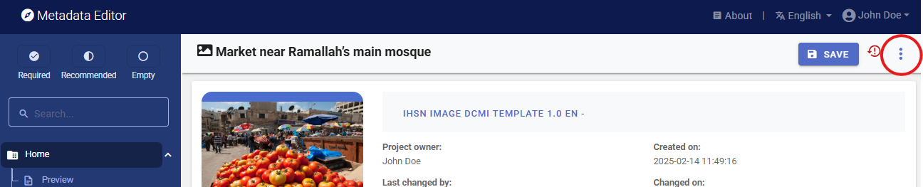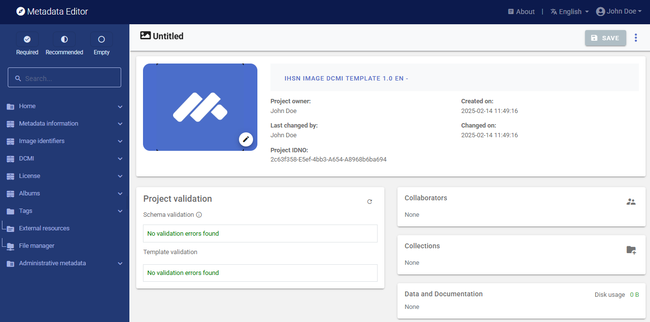 In the navigation tree, select Metadata information / Information on metadata to enter information on who documented the image and when. All information in this section is optional. Enter your name (as Metadata producer) and the date of the day in ISO format YYYY-MM-DD. This is the date when the metadata, not the image, was produced. Then click on SAVE.