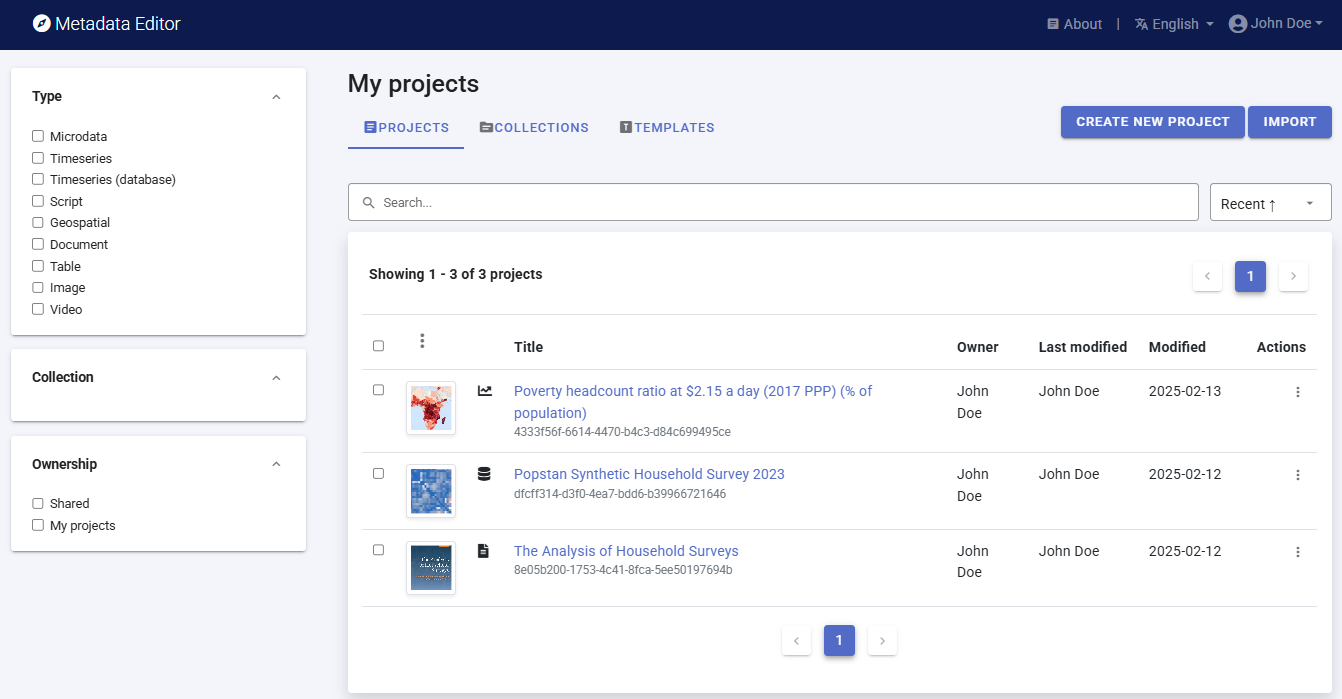 To begin, open the Metadata Editor in your web browser (the URL is determined by where you installed the application), and log in with your username and password. The My projects page will be displayed, showing all projects you have previously created and those that have been shared with you by other data curators, if any. If you are using the application for the first time and no project has been shared with you, the project list will be empty.