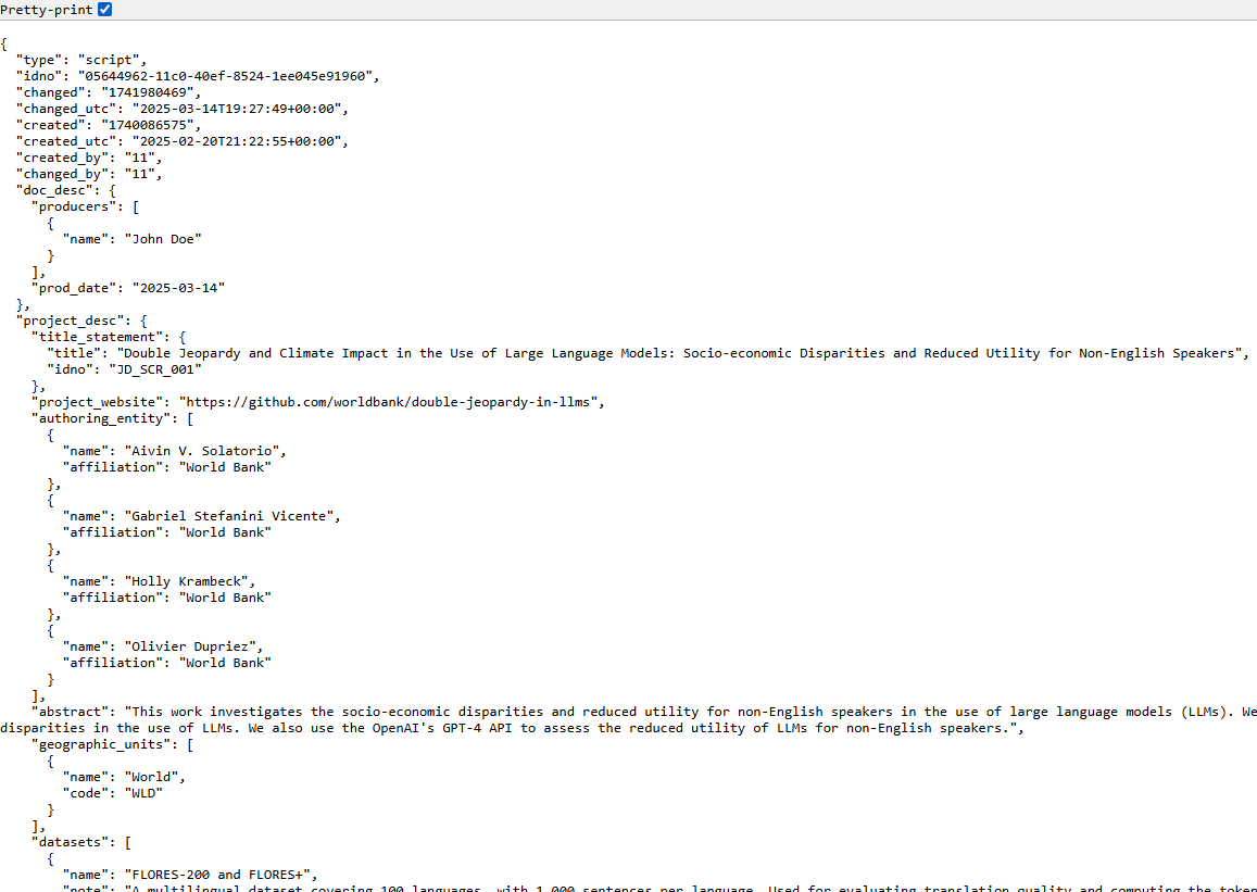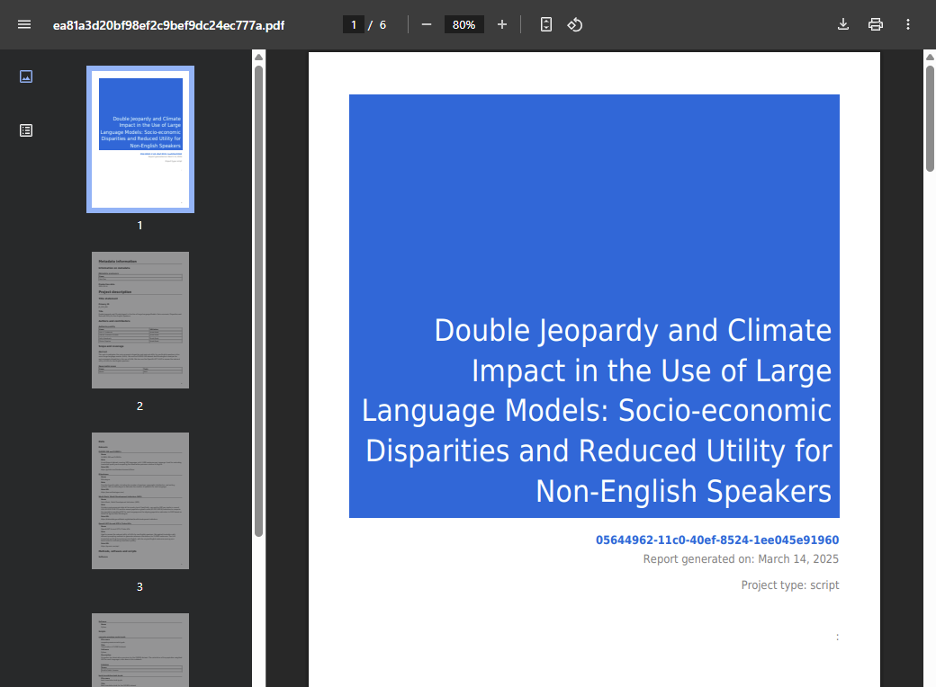 In this Quick start example, we will document a research project titled Double Jeopardy and Climate Impact in the Use of Large Language Models: Socio-economic Disparities and Reduced Utility for Non-English Speakers. The scripts related to the project are available in the following GitHub repository: https://github.com/worldbank/double-jeopardy-in-llms. A working paper was published on arXiv, available at https://arxiv.org/abs/2410.10665. The project used three datasets, one of which is available as open data.