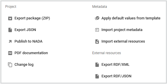 This option will allow you to generate a ZIP file containing all metadata and resources related to the project. This package can be shared with others, who can then import it in their own Metadata Editor.