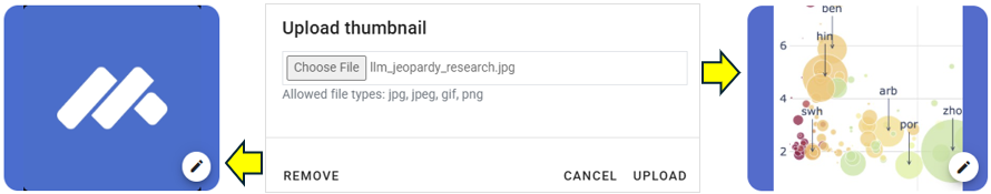 We will use the llm_jeopardy_research.jpg image (or an image of your choice) as a thumbnail. Note that providing a thumbnail is not required, but recommended. The thumbnail will be displayed in the Metadata Editor project list, and in the NADA catalog if the metadata is published in NADA. Click on the edit icon in the screenshot image, and select the image file when prompted.