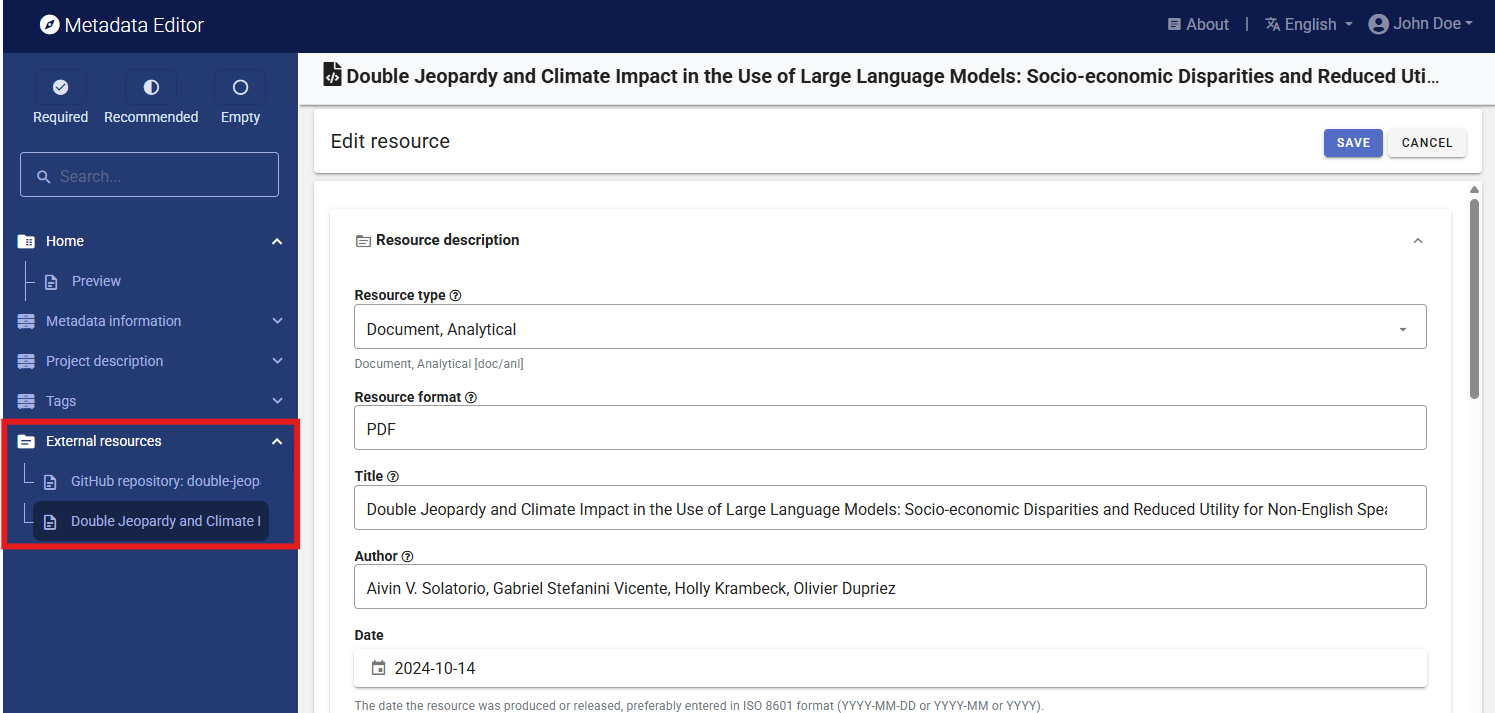 Resource type ("Document, analytical"), enter theTitle*(Double Jeopardy and Climate Impact in the Use of Large Language Models: Socio-economic Disparities and Reduced Utility for Non-English Speakers)*, and enter the URL inResource attachment*https://arxiv.org/abs/2410.10665)*. You may also enter the name of theauthors,date(2024-10-14), andabstract. Then clickSAVE`.