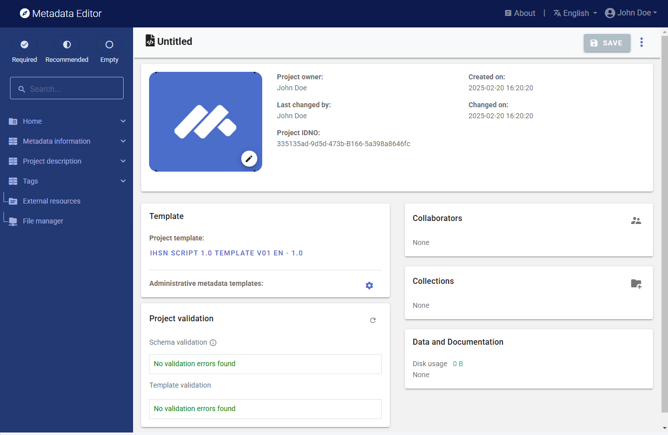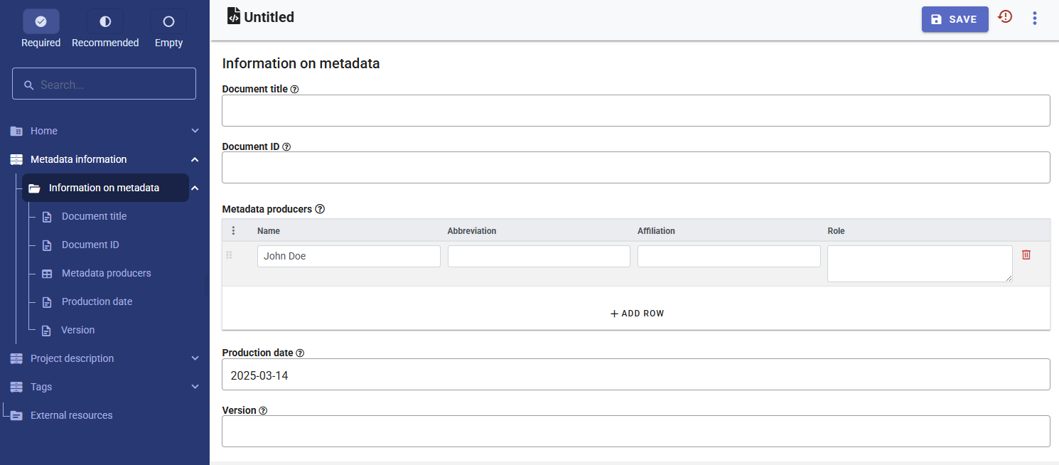 On the left navigation tree, select Metadata information / Information on metadata to enter optional elements used to capture information on who documented the research project, and when. Enter your name (as Metadata producer) and the date of the day in ISO format YYYY-MM-DD. This is the date when the metadata, not the research work, was produced. Then click on SAVE.