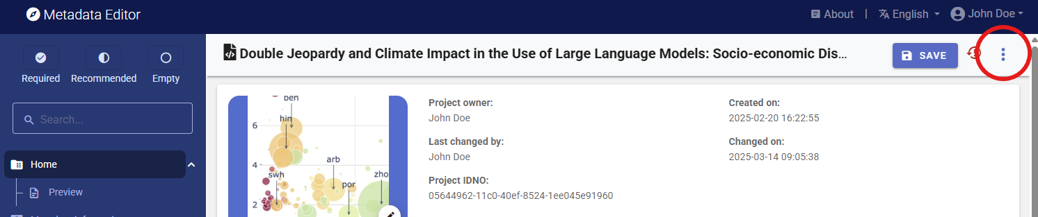 You can now start entering the metadata related to the project itself. In the navigation tree, first select Title statement under Project description, and enter the required Primary ID (a unique identifier of your choice, e.g., JD_SCRIPT_001; if you want to publish the project in a NADA catalog, make sure that this same identifier is not used by another user or for another project). Also, enter the title of the project: "Double Jeopardy and Climate Impact in the Use of Large Language Models: Socio-economic Disparities and Reduced Utility for Non-English Speakers". Click SAVE`.
