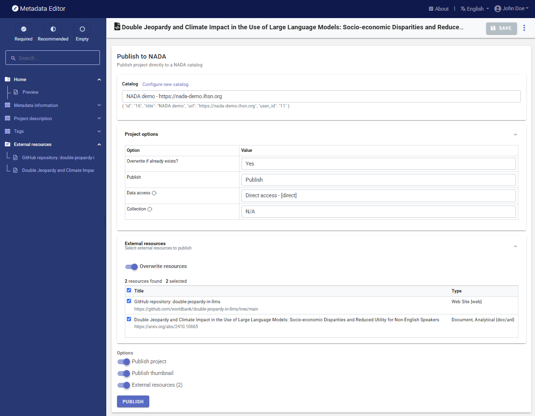 If you have a NADA catalog and the credentials to publish content in it, you can also "Publish to NADA". Select a configured NADA catalog, select the options as shown in the screenshot below, and click PUBLISH.