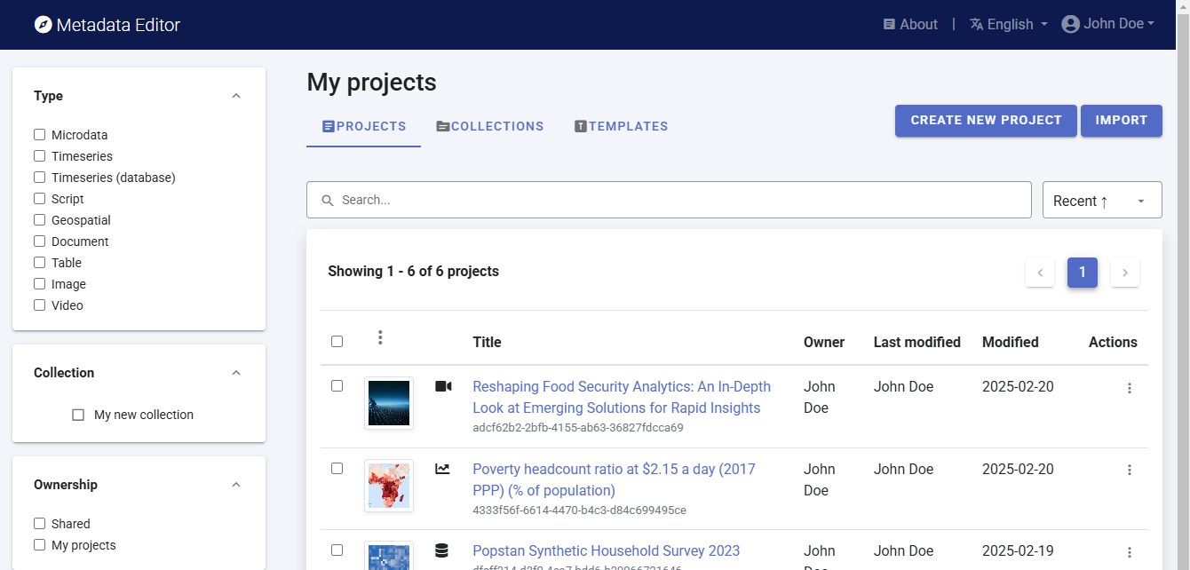 To begin, open the Metadata Editor in your web browser (the URL is determined by where you installed the application), and log in with your username and password. The My projects page will be displayed, showing all projects you have previously created and those that have been shared with you by other data curators, if any. If you are using the application for the first time and no project has been shared with you, the project list will be empty.