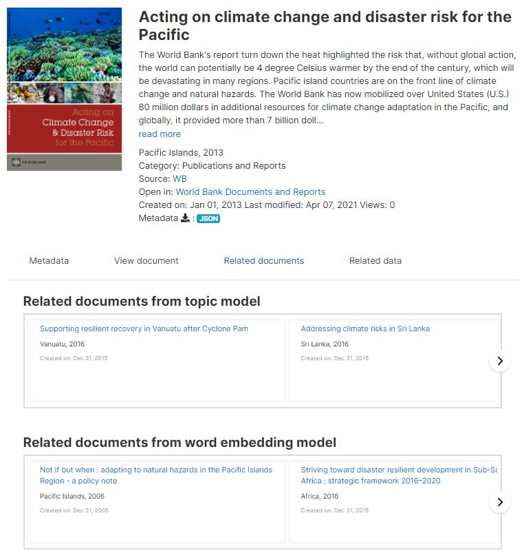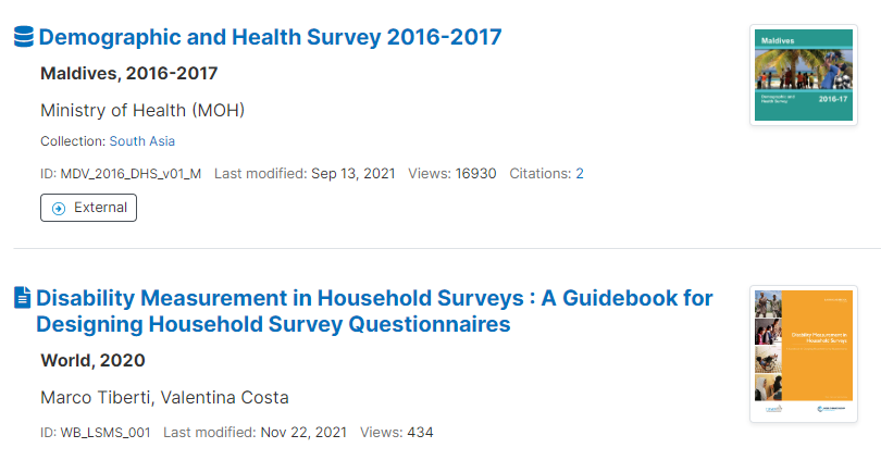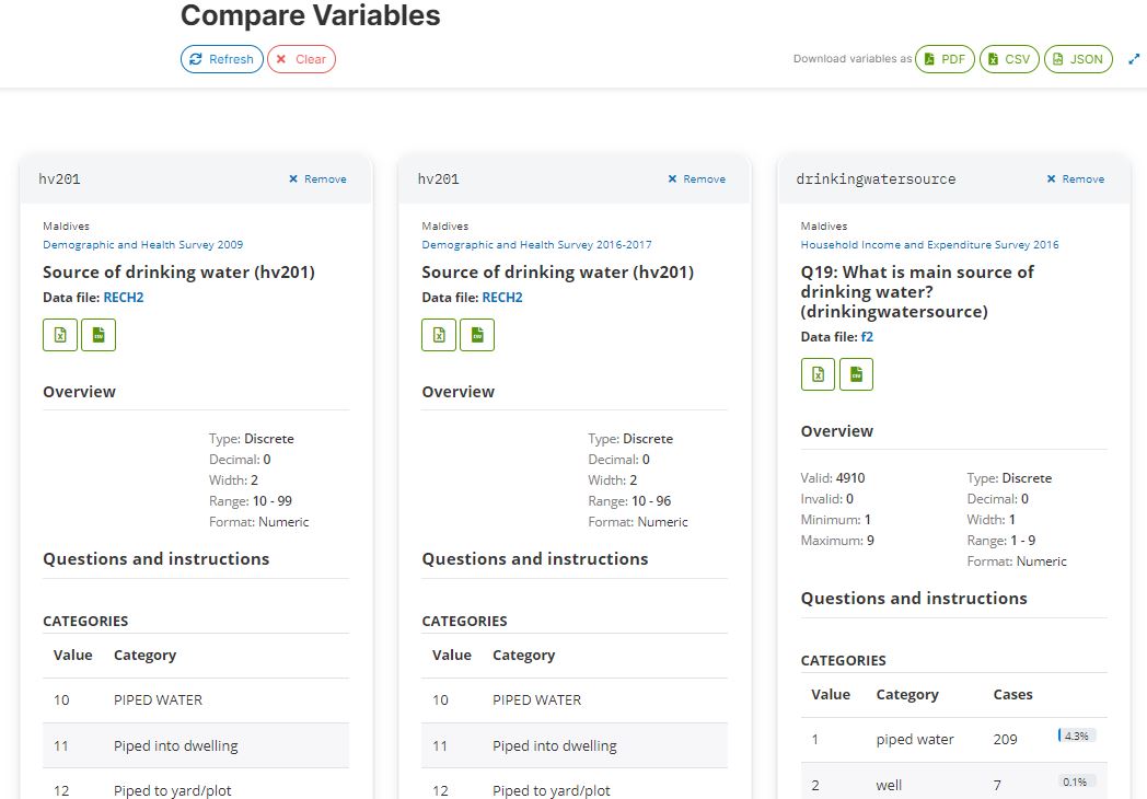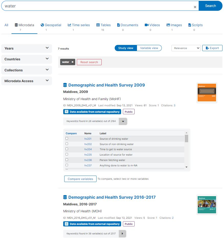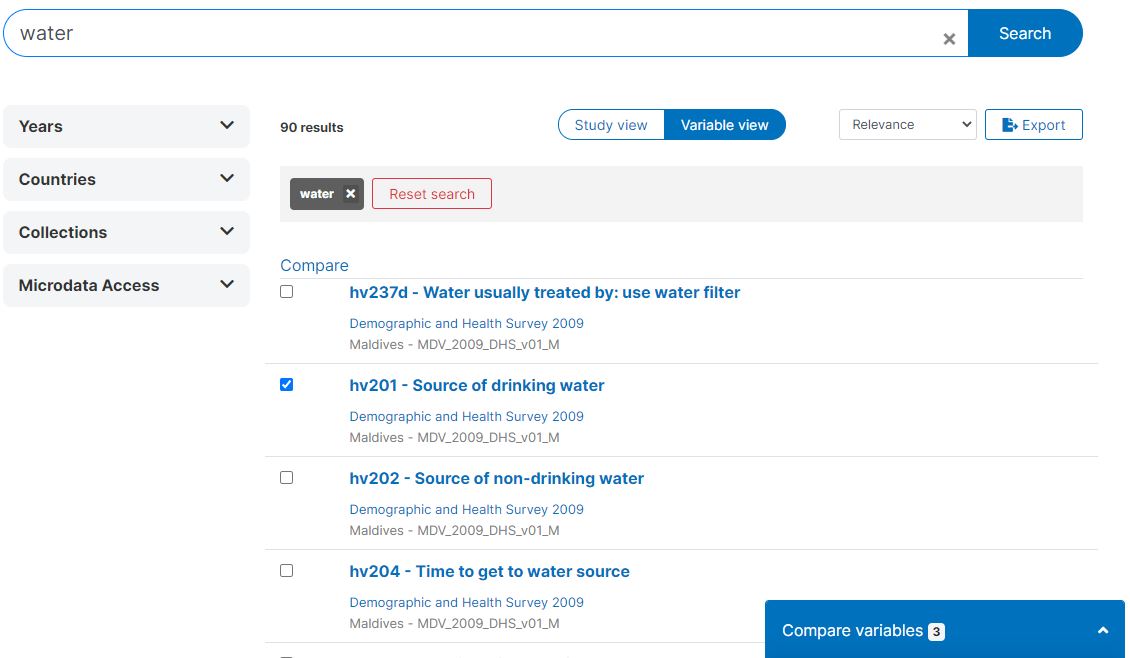 This features is specific to microdata. E-commerce platforms commonly allow customers to compare products by displaying their pictures and descriptions side-by-side. Similarly, for data users, the ability to compare datasets can be valuable to evaluate the consistency or comparability of a variable or an indicator over time or across sources and countries. However, to implement this functionality, detailed and structured metadata at the variable level are necessary. These metadata standards, such as DDI and ISO 19110/19139, enable the implementation of this feature. In the example below, we show how a query for water returns not only a list of seven datasets, but also a list of variables in each dataset that match the query.