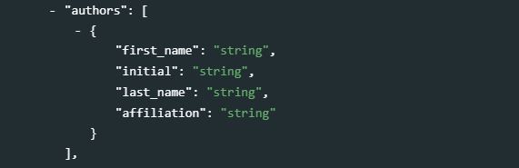 In the documents schema, authors are documented in the metadata element authors which contains the following sub-elements: first_name, initial, last_name, and affiliation.