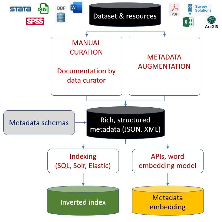 Acquisition: Search engines like Google and Bing acquire metadata by crawling billions of web pages using web crawlers (or bots), with an objective to cover the entire web. Guidance is available to webmasters on how to optimize websites for visibility (see for example Google’s Search Engine Optimization (SEO) Starter Guide. The search tools embedded in specialized data catalogs have a much simpler task, as the catalog administrators and curators generate or control, and provide, the well-contained content to be indexed. In a cataloguing application like NADA, this content is provided in the form of structured metadata files saved in JSON or XML format. For textual data (documents), the content of the document (not only the metadata on the) can also be indexed. The process of acquisition/extraction of metadata by the search engine tool must preserve the structure of the metadata, in its original or in a modified form. This will be critical for optimizing the performance of the search tool and the ranking of query results (e.g., a keyword found in a document title may have more weight than the same keyword found in the document abstract), for implementing facets, or for providing advanced search options (e.g., search only in the “authors” metadata field).