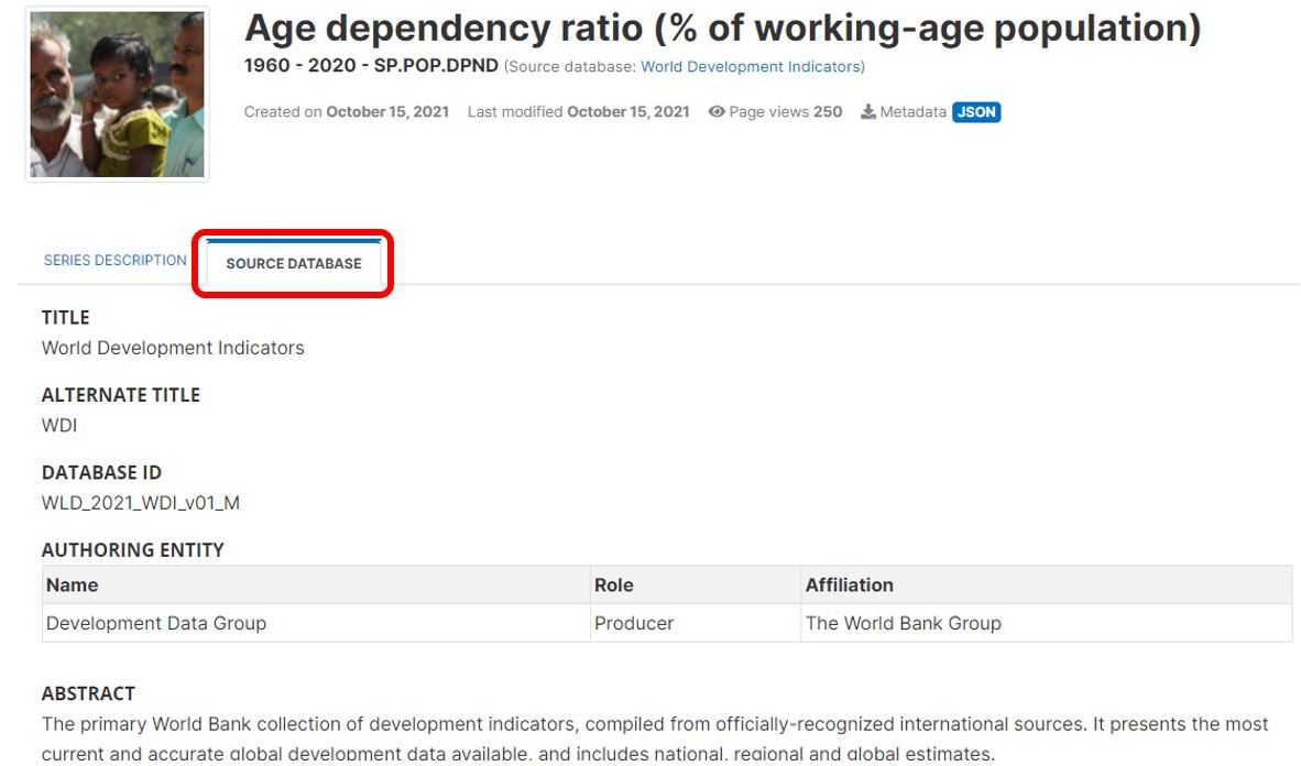 The (optional) SOURCE DATABASE tab will display the metadata related to the database, i.e. all content entered in the series database schema. This information is displayed for information, but not indexed in the NADA catalog (i.e. not searchable).