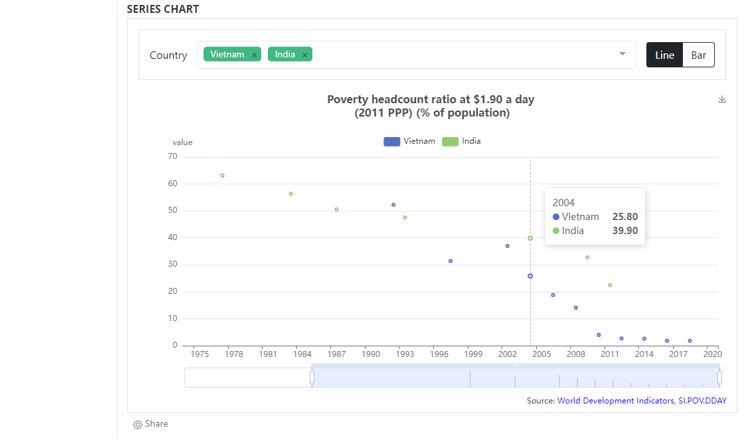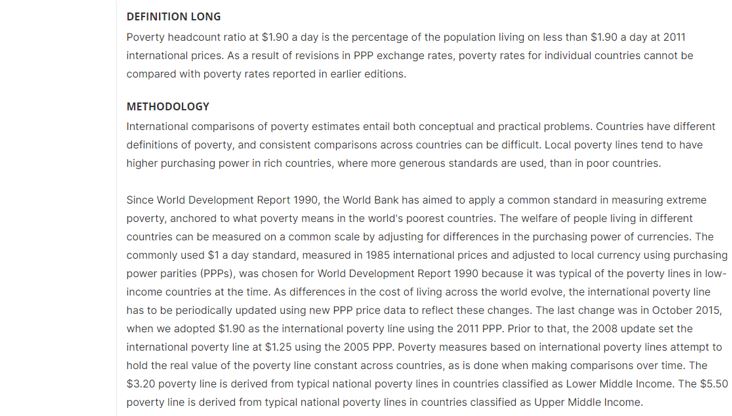 methodology = "International comparisons of poverty estimates entail both conceptual and practical problems. Countries have different definitions of poverty, and consistent comparisons across countries can be difficult. Local poverty lines tend to have higher purchasing power in rich countries, where more generous standards are used, than in poor countries. Since World Development Report 1990, the World Bank has aimed to apply a common standard in measuring extreme poverty, anchored to what poverty means in the world's poorest countries. The welfare of people living in different countries can be measured on a common scale by adjusting for differences in the purchasing power of currencies. The commonly used $1 a day standard, measured in 1985 international prices and adjusted to local currency using purchasing power parities (PPPs), was chosen for World Development Report 1990 because it was typical of the poverty lines in low-income countries at the time. As differences in the cost of living across the world evolve, the international poverty line has to be periodically updated using new PPP price data to reflect these changes. The last change was in October 2015, when we adopted $1.90 as the international poverty line using the 2011 PPP. Prior to that, the 2008 update set the international poverty line at $1.25 using the 2005 PPP. Poverty measures based on international poverty lines attempt to hold the real value of the poverty line constant across countries, as is done when making comparisons over time. The $3.20 poverty line is derived from typical national poverty lines in countries classified as Lower Middle Income. The $5.50 poverty line is derived from typical national poverty lines in countries classified as Upper Middle Income. Early editions of World Development Indicators used PPPs from the Penn World Tables to convert values in local currency to equivalent purchasing power measured in U.S dollars. Later editions used 1993, 2005, and 2011 consumption PPP estimates produced by the World Bank. The current extreme poverty line is set at $1.90 a day in 2011 PPP terms, which represents the mean of the poverty lines found in 15 of the poorest countries ranked by per capita consumption. The new poverty line maintains the same standard for extreme poverty - the poverty line typical of the poorest countries in the world - but updates it using the latest information on the cost of living in developing countries. As a result of revisions in PPP exchange rates, poverty rates for individual countries cannot be compared with poverty rates reported in earlier editions. The statistics reported here are based on consumption data or, when unavailable, on income surveys. Analysis of some 20 countries for which income and consumption expenditure data were both available from the same surveys found income to yield a higher mean than consumption but also higher inequality. When poverty measures based on consumption and income were compared, the two effects roughly cancelled each other out: there was no significant statistical difference.",