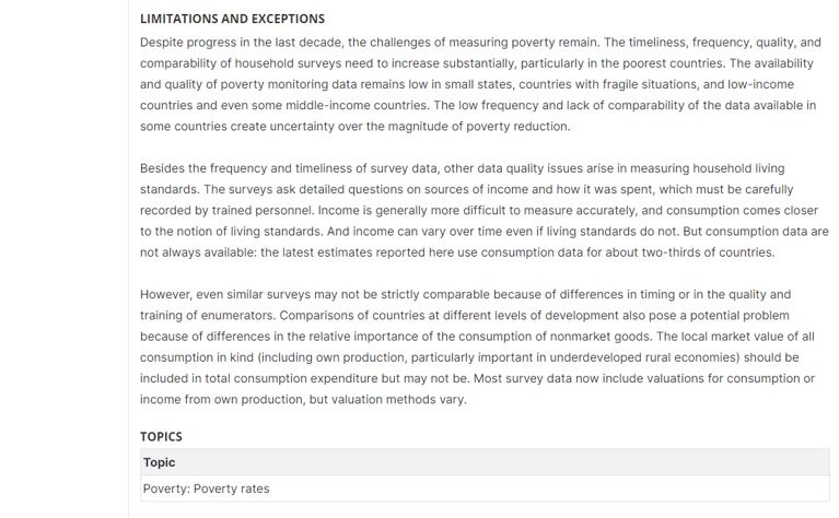 limitation = "Despite progress in the last decade, the challenges of measuring poverty remain. The timeliness, frequency, quality, and comparability of household surveys need to increase substantially, particularly in the poorest countries. The availability and quality of poverty monitoring data remains low in small states, countries with fragile situations, and low-income countries and even some middle-income countries. The low frequency and lack of comparability of the data available in some countries create uncertainty over the magnitude of poverty reduction. Besides the frequency and timeliness of survey data, other data quality issues arise in measuring household living standards. The surveys ask detailed questions on sources of income and how it was spent, which must be carefully recorded by trained personnel. Income is generally more difficult to measure accurately, and consumption comes closer to the notion of living standards. And income can vary over time even if living standards do not. But consumption data are not always available: the latest estimates reported here use consumption data for about two-thirds of countries. However, even similar surveys may not be strictly comparable because of differences in timing or in the quality and training of enumerators. Comparisons of countries at different levels of development also pose a potential problem because of differences in the relative importance of the consumption of nonmarket goods. The local market value of all consumption in kind (including own production, particularly important in underdeveloped rural economies) should be included in total consumption expenditure but may not be. Most survey data now include valuations for consumption or income from own production, but valuation methods vary.",